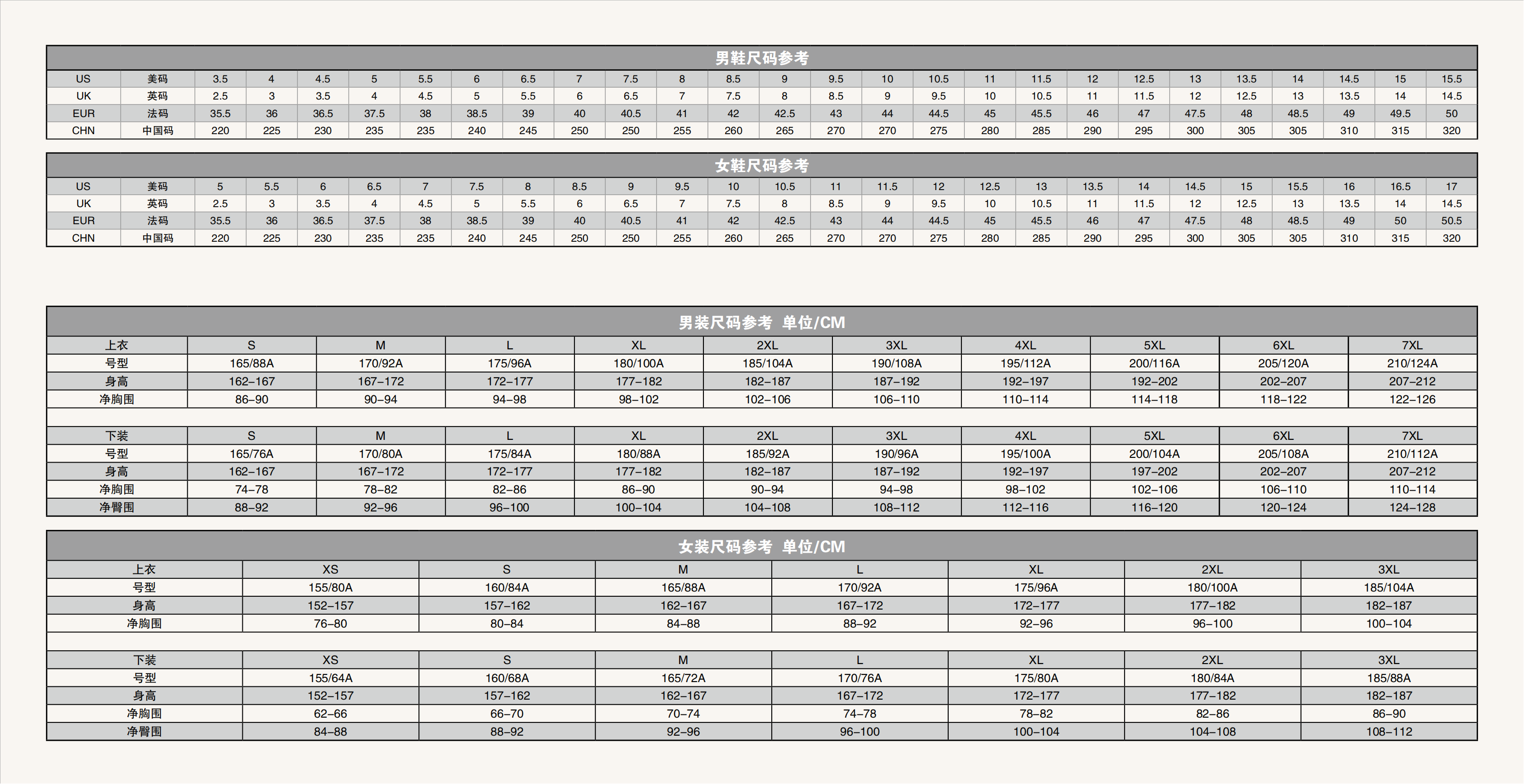 尺码参考