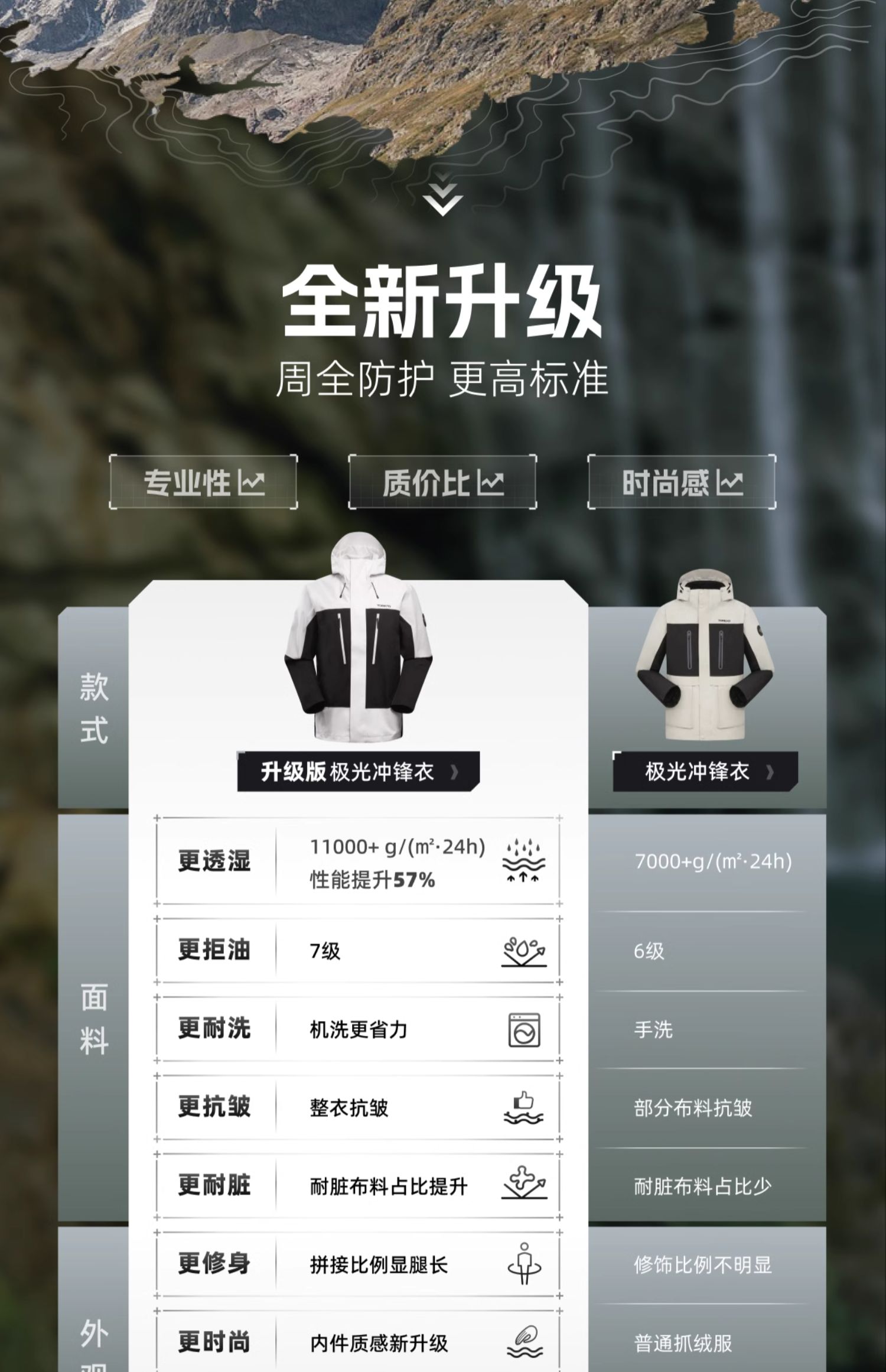 设计点:冲锋衣外件:T800塔丝隆斜纹布,手感棉感有骨感,背面复合高防水透湿薄膜,防水透湿3k/4k,布面经过TIEF GUARD三防处理,防水防油耐沾污,可减少洗涤次数,节水环保。