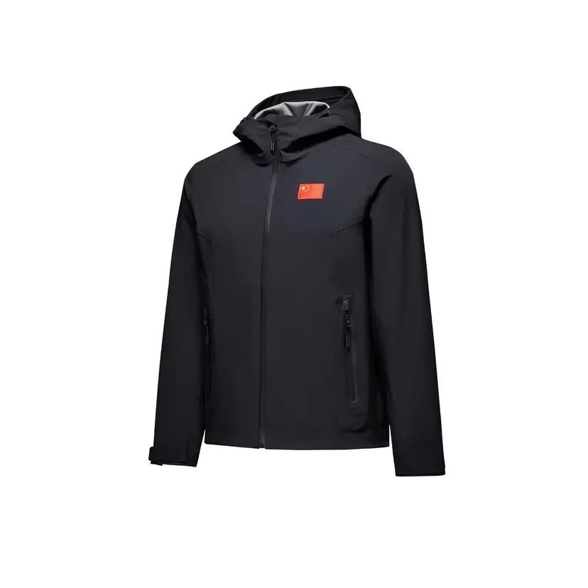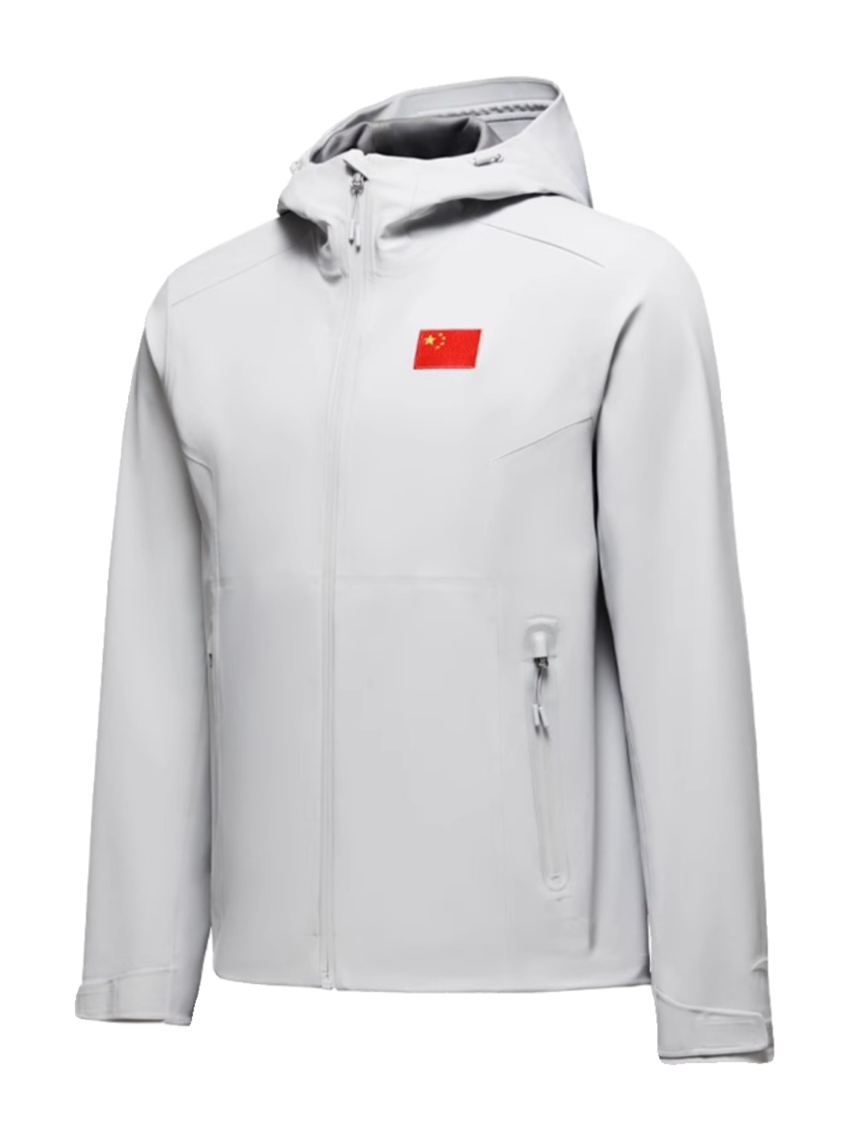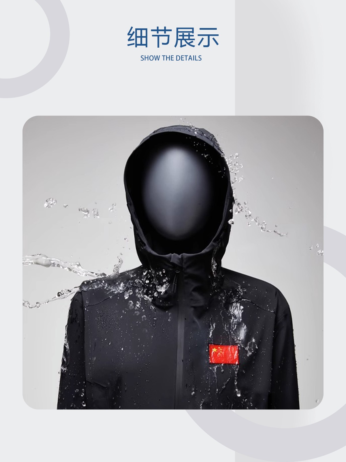 设计点:整身服装具有防水透气的功能,内层面料具有抗菌功能,外层面料防水且使用无缝贴合技术, 前胸和两侧拉链使用防水拉链,能够有效抵挡户外下雨情景。面料整体微弹,便于穿着活动。