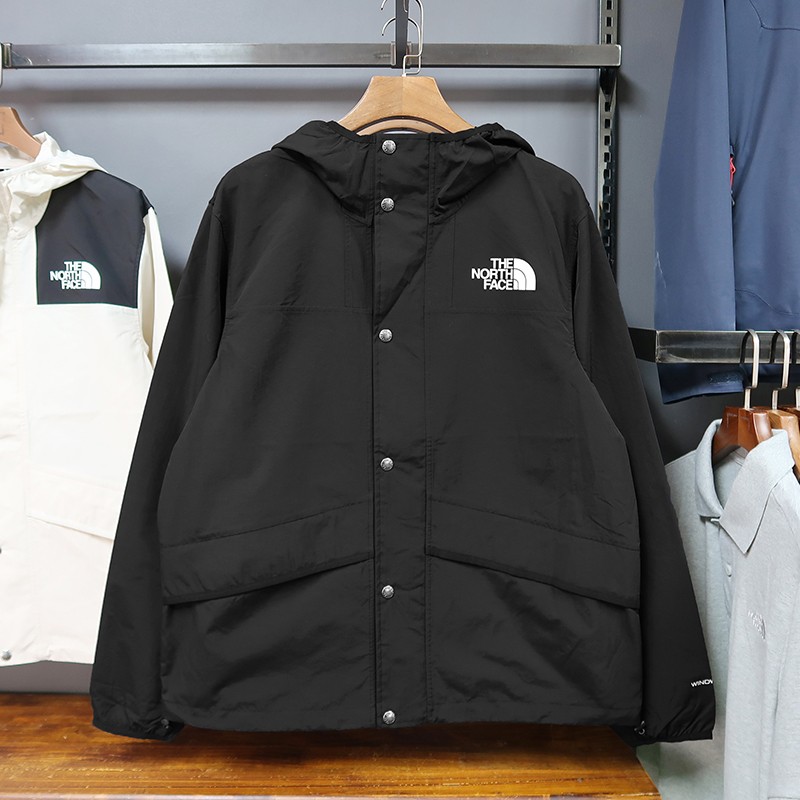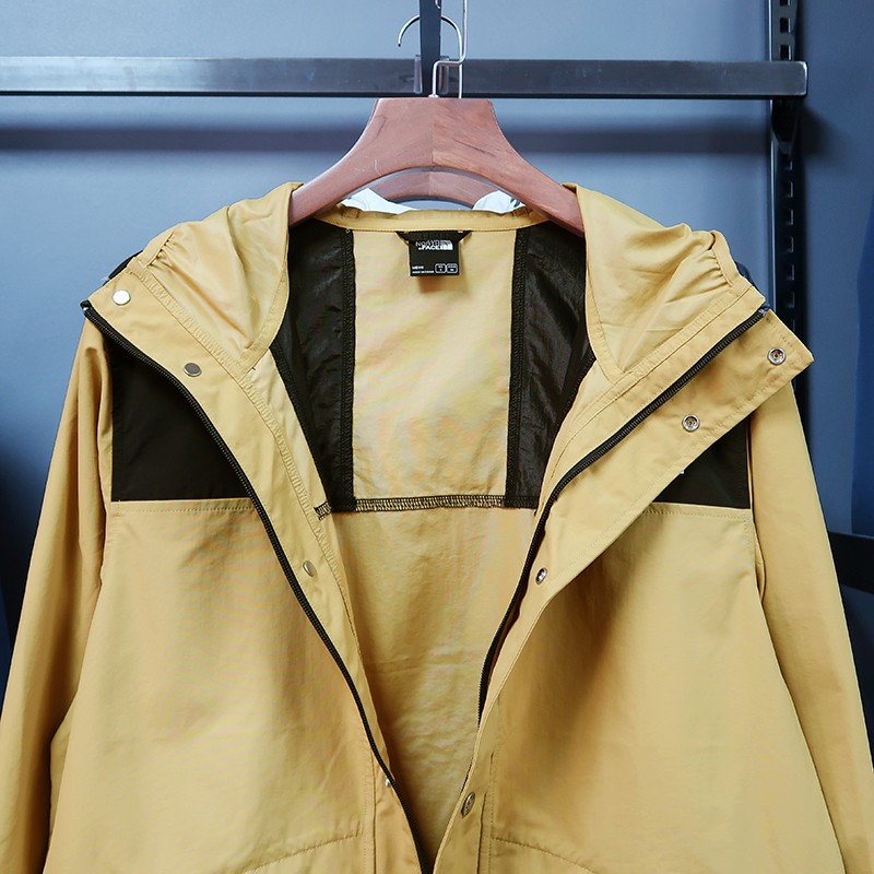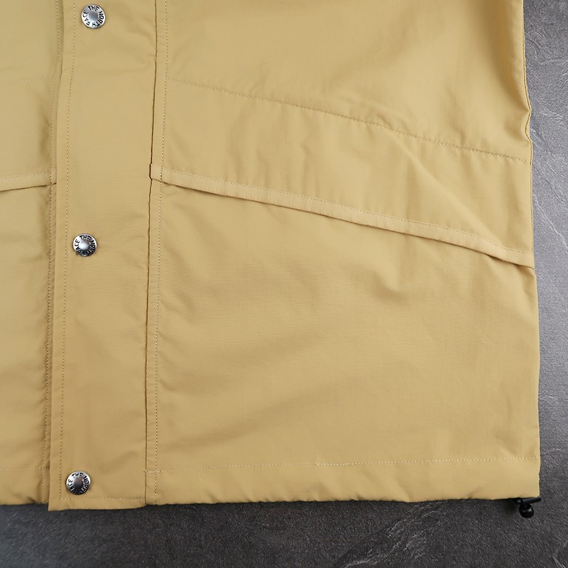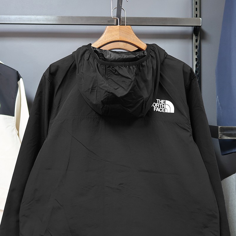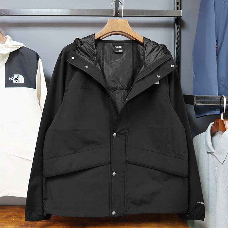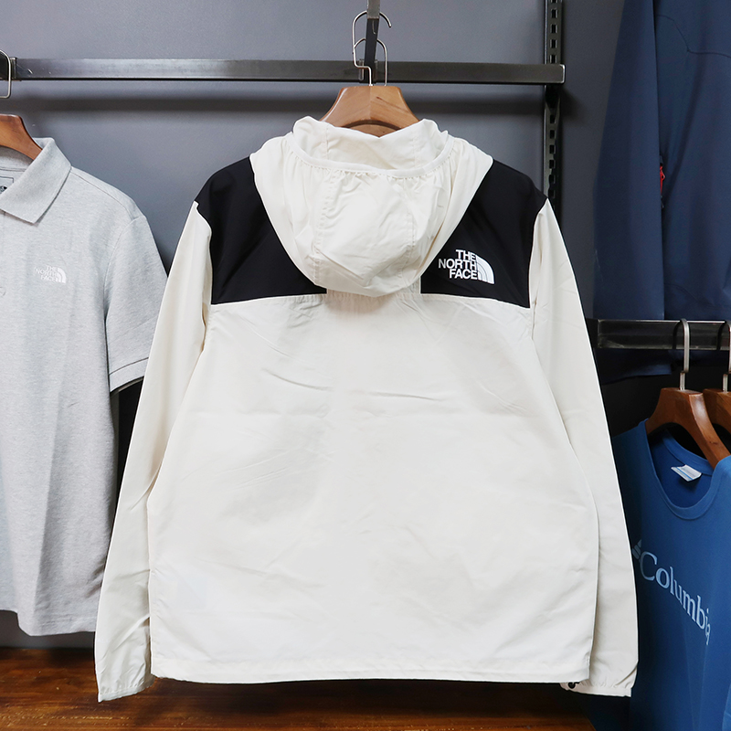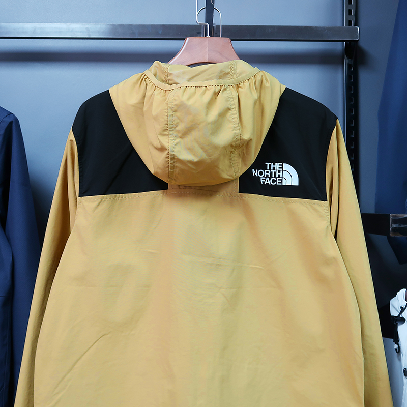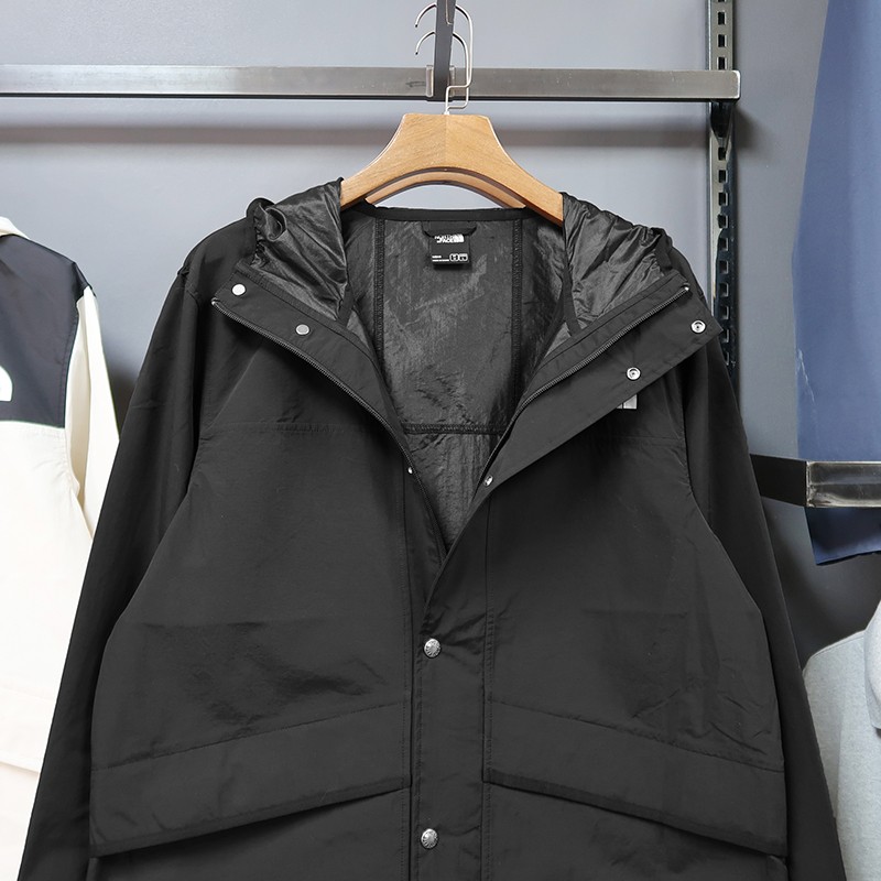 设计点:亚洲版型,宽松剪裁;防风面料;DWR防泼水处理,防护性更强;三片式固定风帽;带搭扣闭合和前中反装拉链的防风片设计;带反装开口的带盖插手贴袋设计;风帽、口袋和袖口带弹力滚边设计;下摆抽绳配有绳锁扣,便于调节;左胸和右后肩带丝印品牌标识设计。