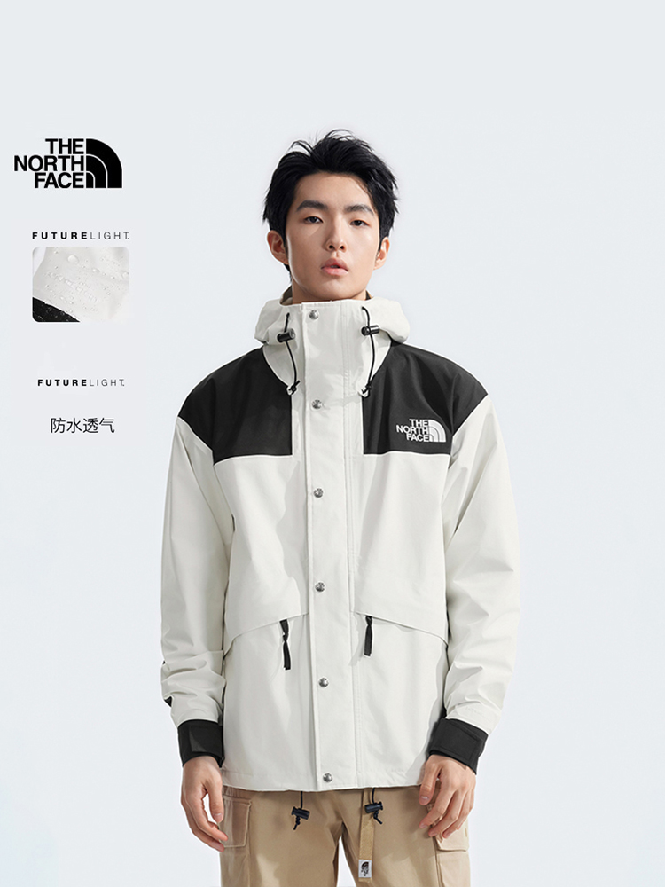 设计点:美国版型,宽松剪裁;透气、防水、压胶设计的外壳;风帽和下半身带压花品牌标识衬里;可调节的袖口粘扣设计