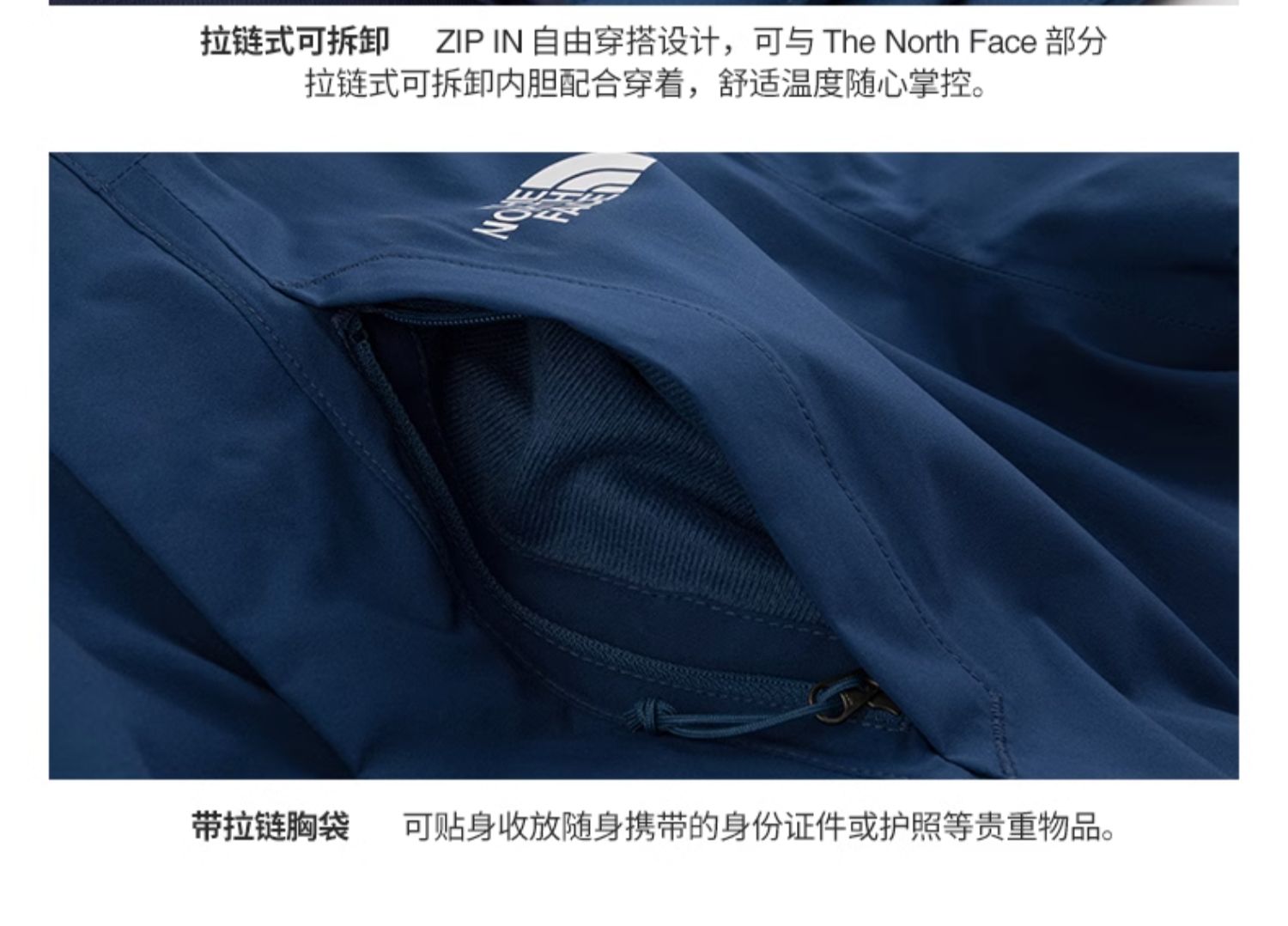 设计点:亚洲版型,宽松剪裁;外层夹克防水面料,无缝工艺;袖口一片式设计;风帽可调。
