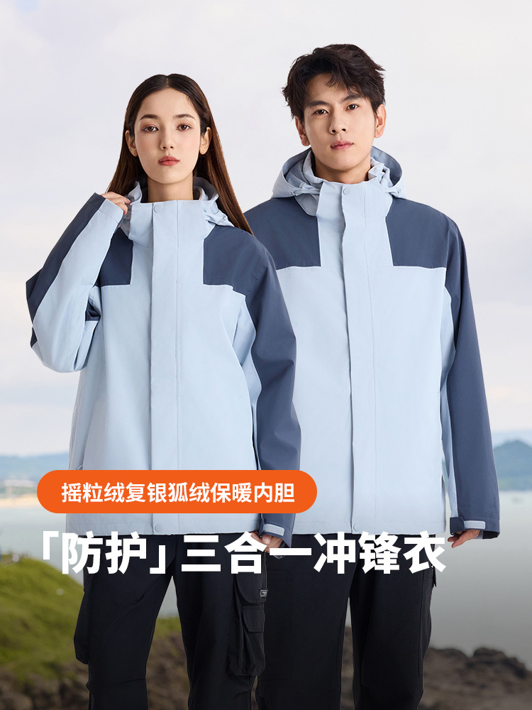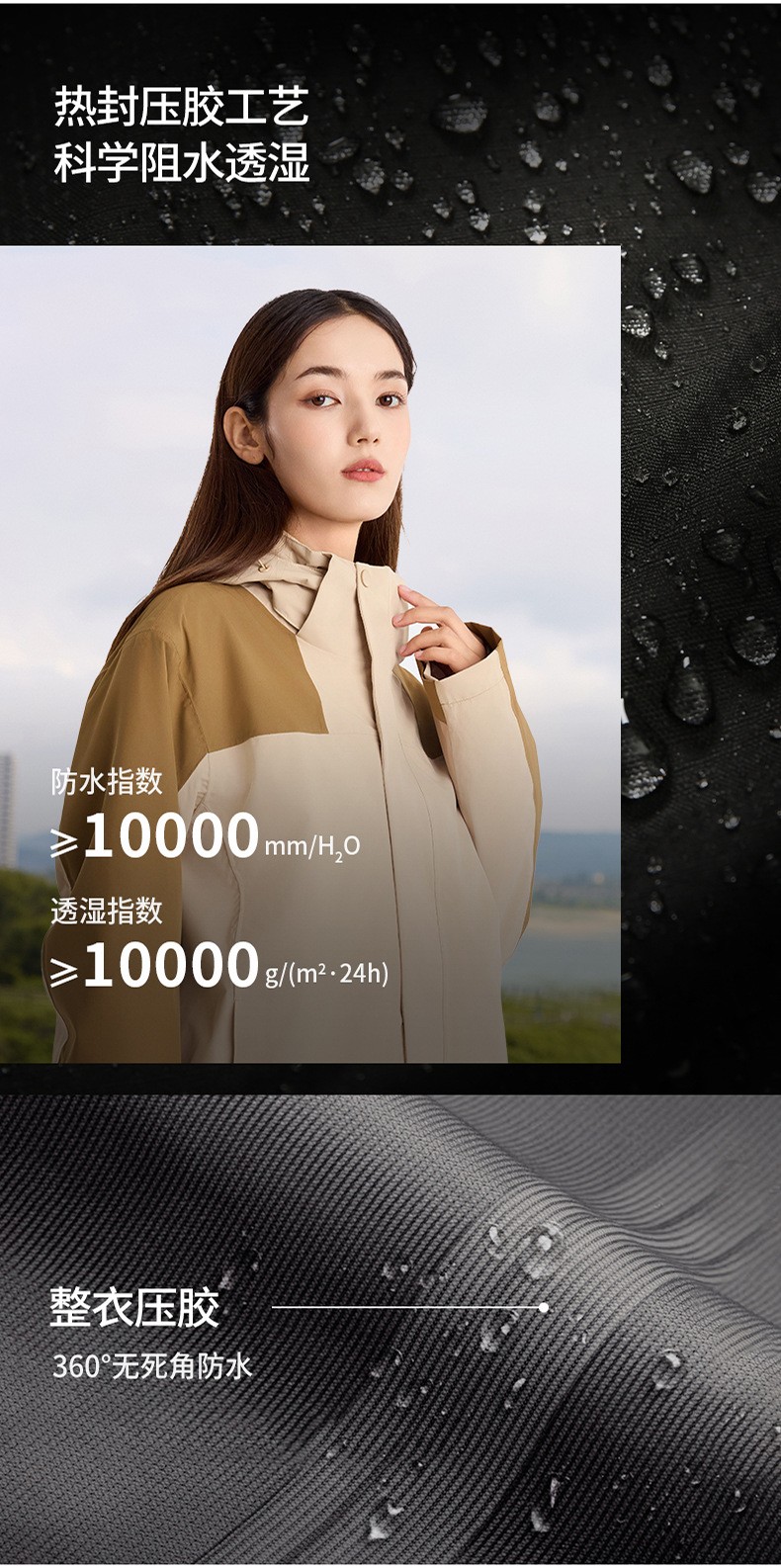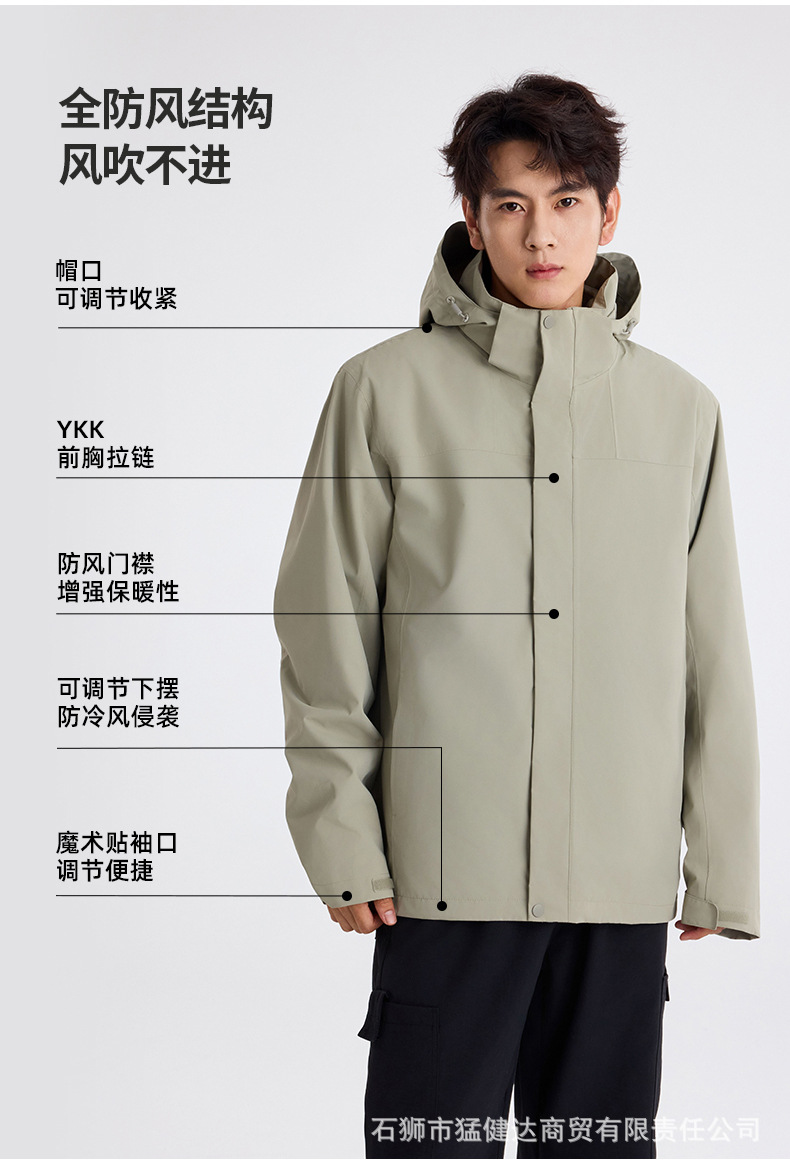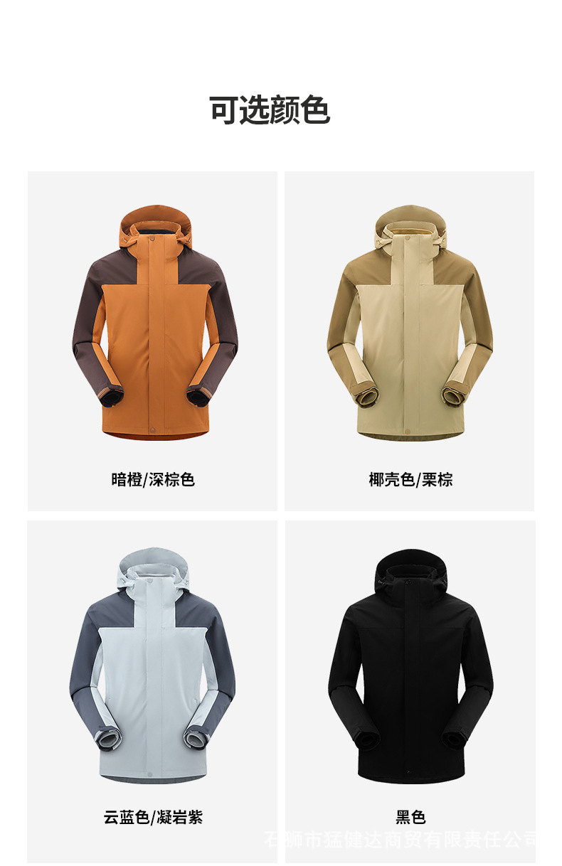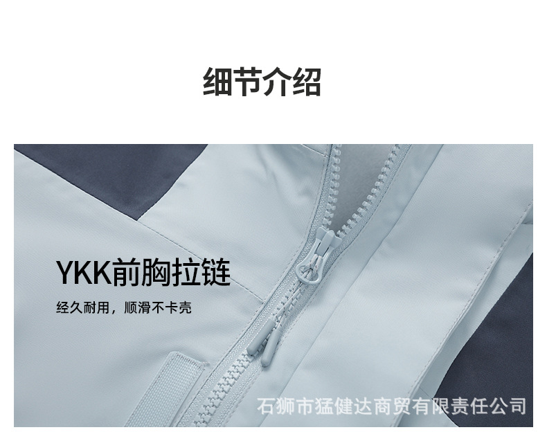 设计点:75D双经双纬棉感小牛津贴高透白膜静水压、透湿率5000+,四级防泼水杜邦四防科技,防水防风、防油防污YKK品质拉链,经久耐用顺滑不卡壳全衣缝位热封压胶,国家二级冲锋衣360g亲肤银狐绒内胆,抗静电科技.