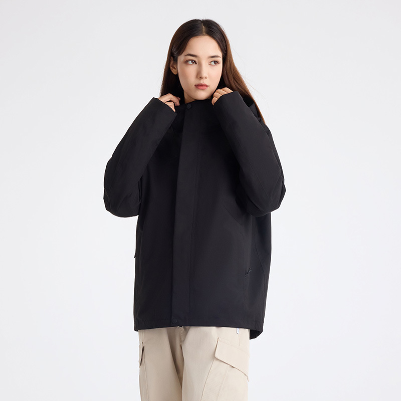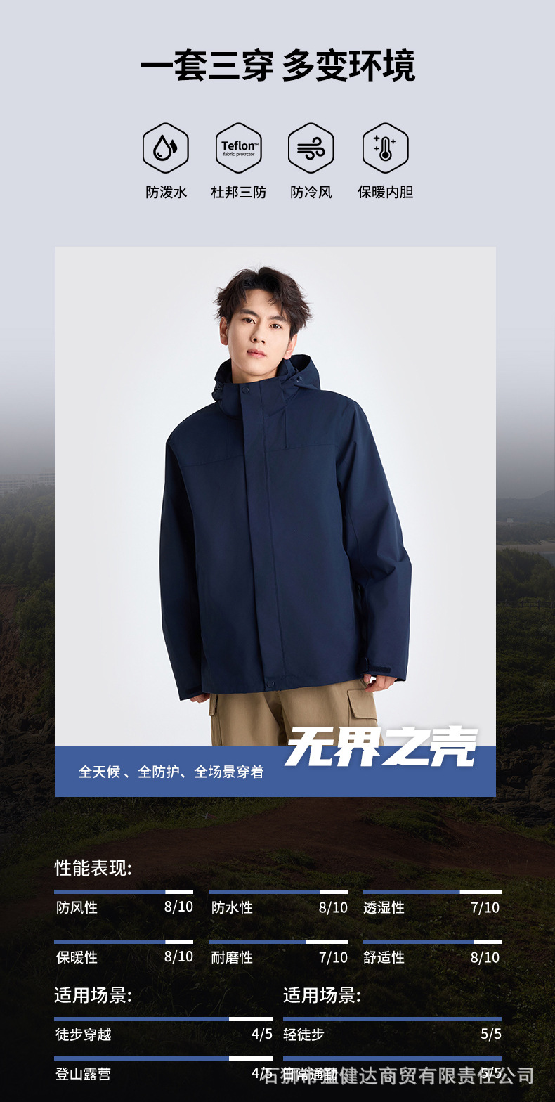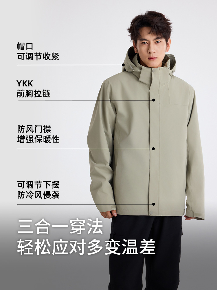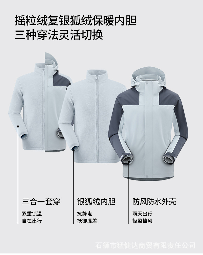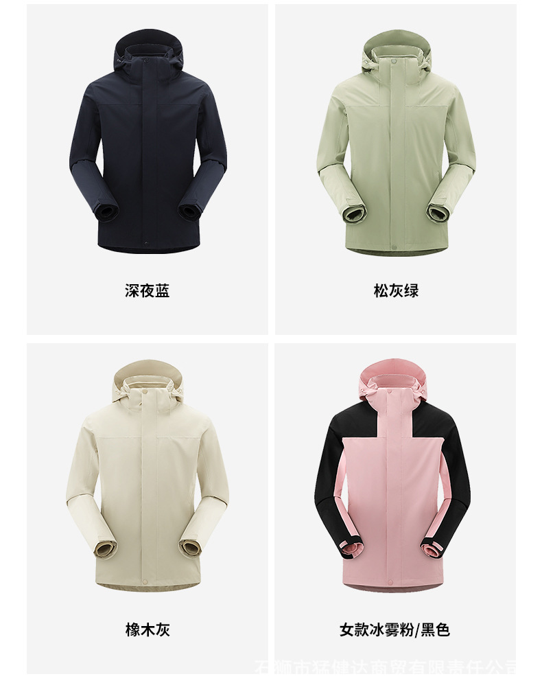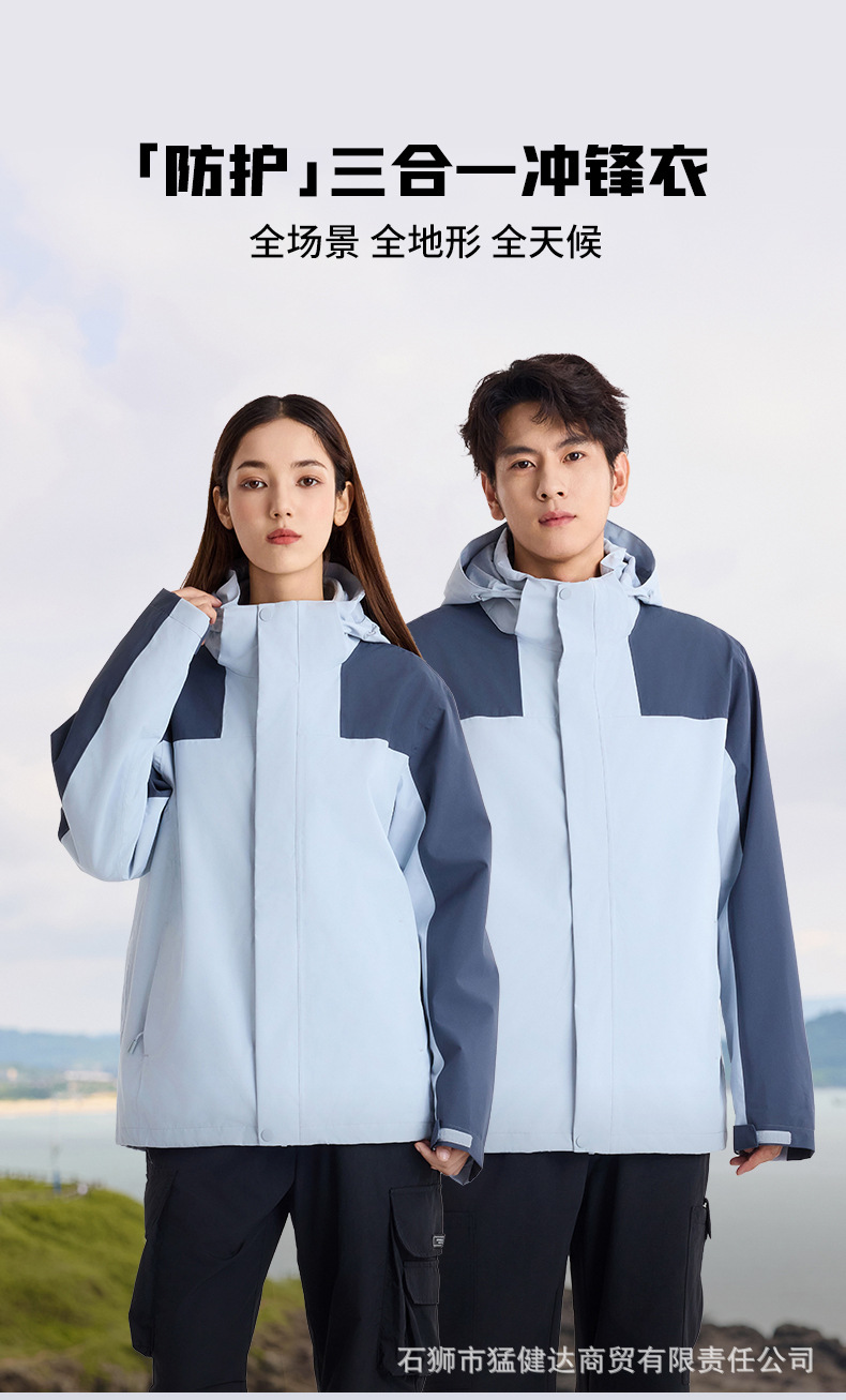 设计点:75D双经双纬棉感小牛津贴高透白膜静水压、透湿率5000+,四级防泼水杜邦四防科技,防水防风、防油防污YKK品质拉链,经久耐用顺滑不卡壳全衣缝位热封压胶,国家二级冲锋衣360g亲肤银狐绒内胆,抗静电科技.