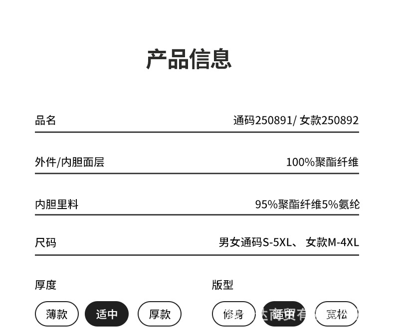 材质:外套、内胆面层:100%聚酯纤维 内胆里层:95%聚酯纤维5%氨纶