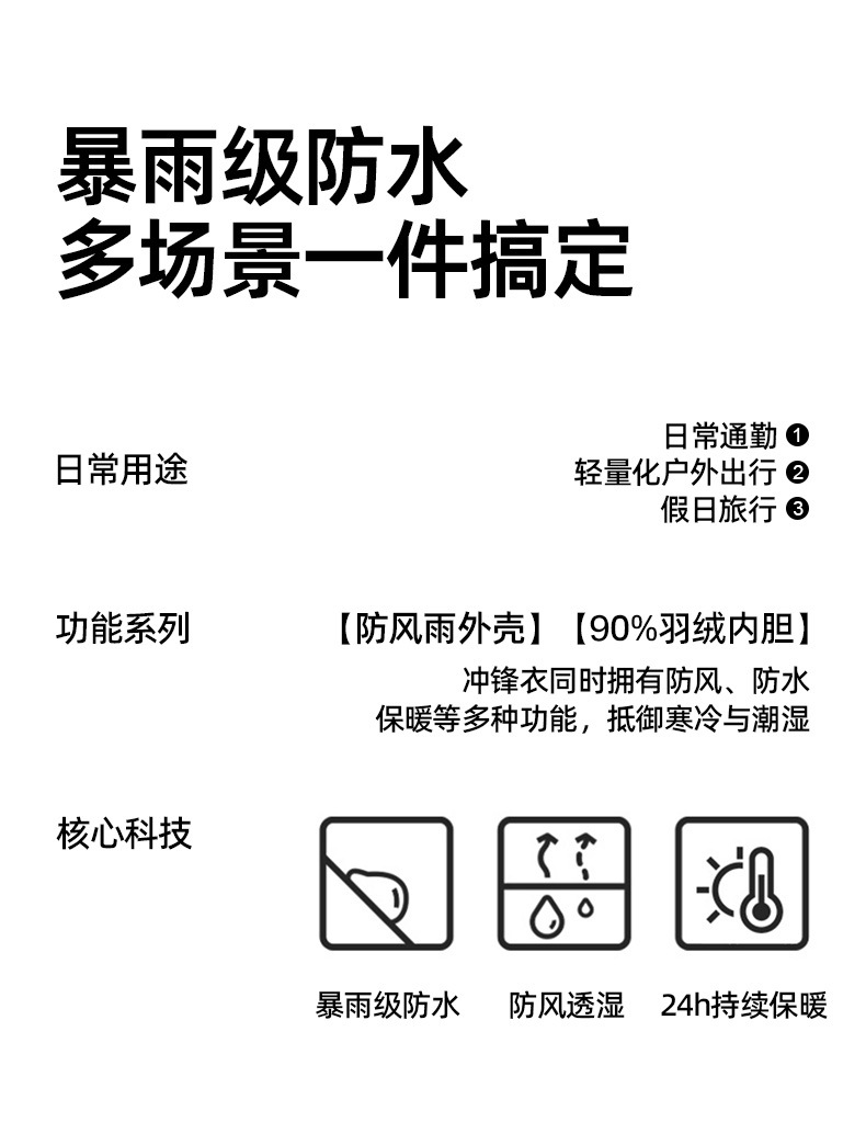 设计点:75D双股棉感小牛津,不易褪色变形GAOTAIER-TEX高太尔科技面料防水指数10000,透湿指数7680全衣缝位热封压胶,国家二级冲锋衣新国标90白鸭绒内胆,石墨烯聚热科技.