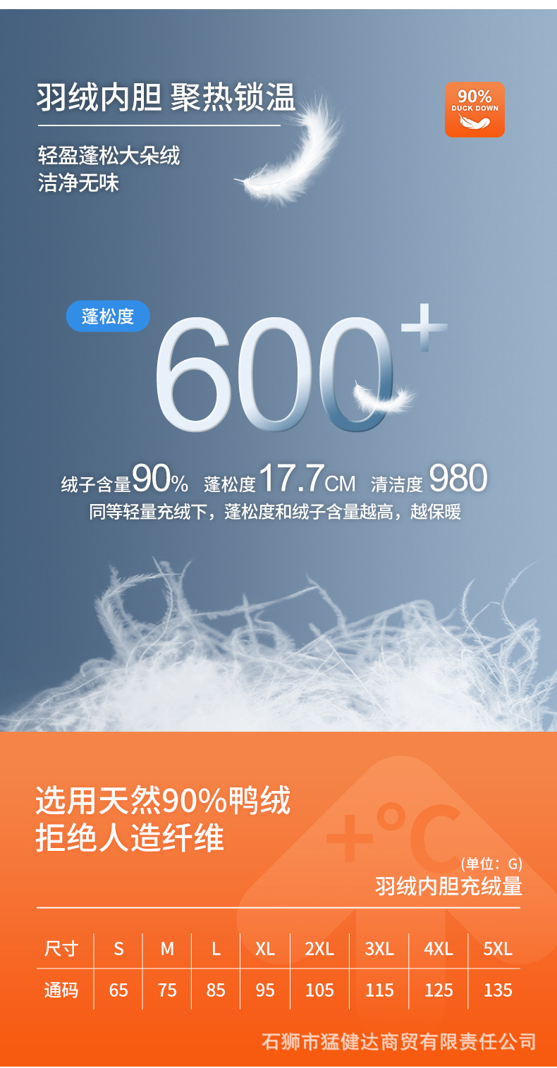 材质:面料:100%聚酯纤维 里料:100%聚酯纤维 填充物:90%鸭绒