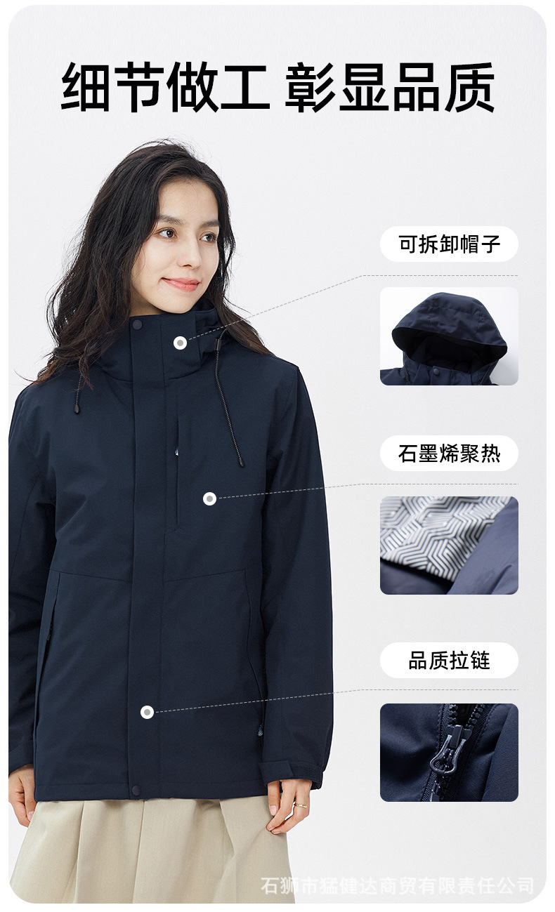 设计点:75D单经双纬小牛津,不易褪色变形石墨烯聚热科技内胆,保暖锁温外套内胆可拆卸组合,一衣三式穿YKK品质拉链,经久耐用顺滑不卡壳80%羽绒无缝内胆,抗静电,不跑绒.