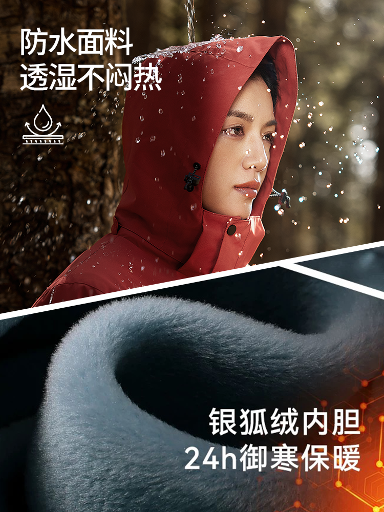 设计点:跟色银狐绒内胆,正品YKK正品拉 链,连帽设计款式防风防泼水。