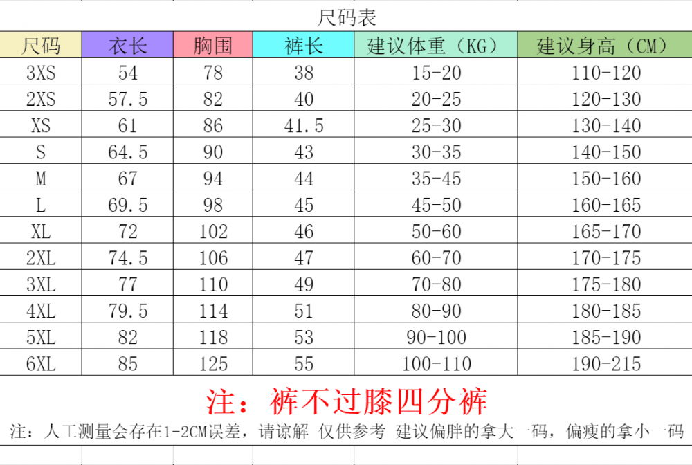 尺码:3XS-6XL