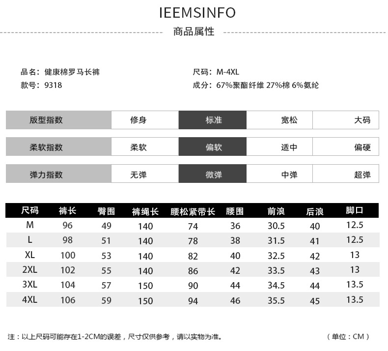 材质:67%聚脂纤维;27%棉;6%氨纶