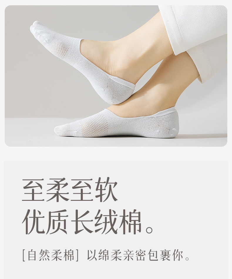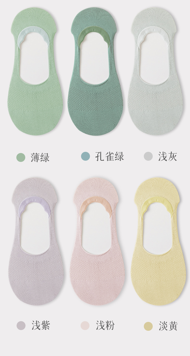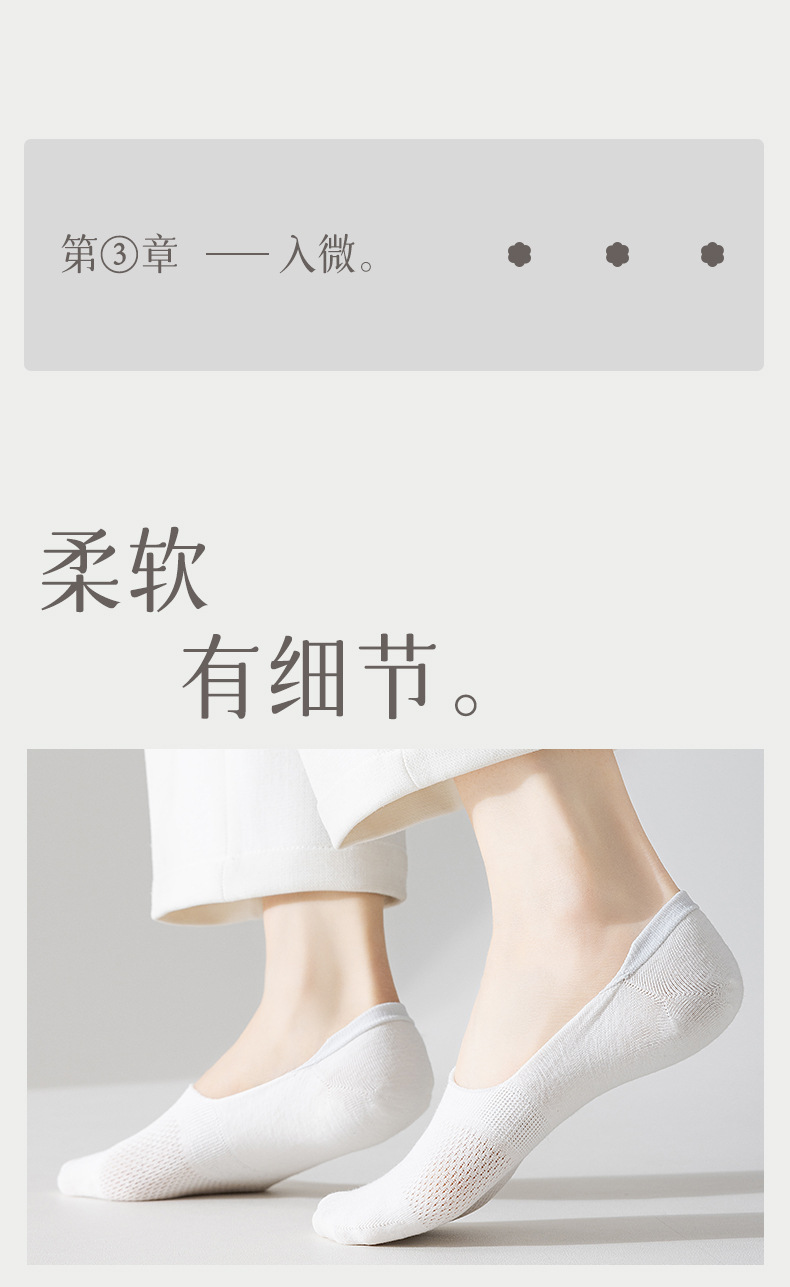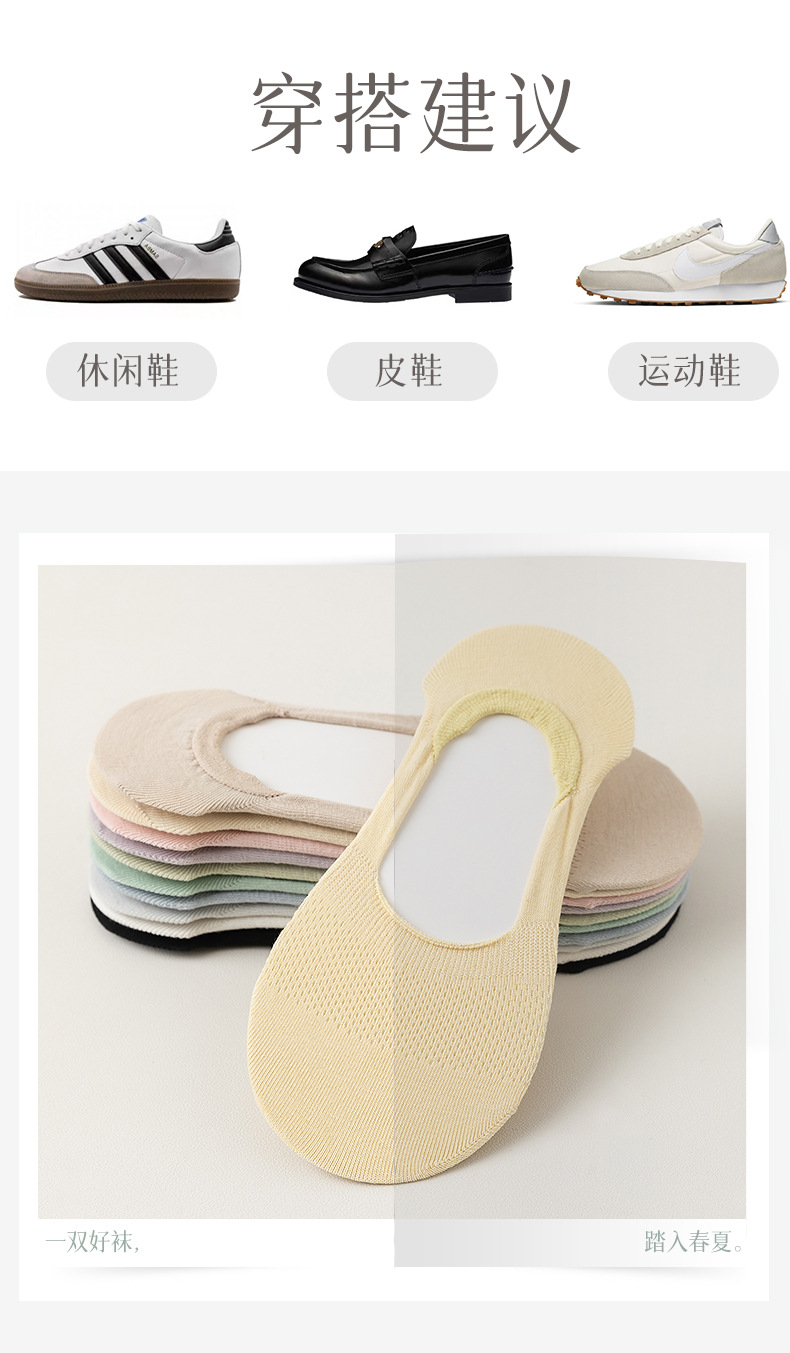 工艺:200针短袜、40支紧密赛络、四级抗起球、3A抗菌、手工缝合,网眼超薄透气隐形袜,后跟硅胶防掉跟