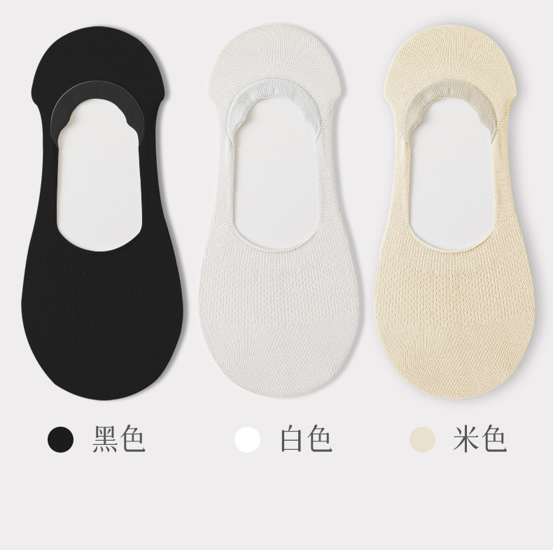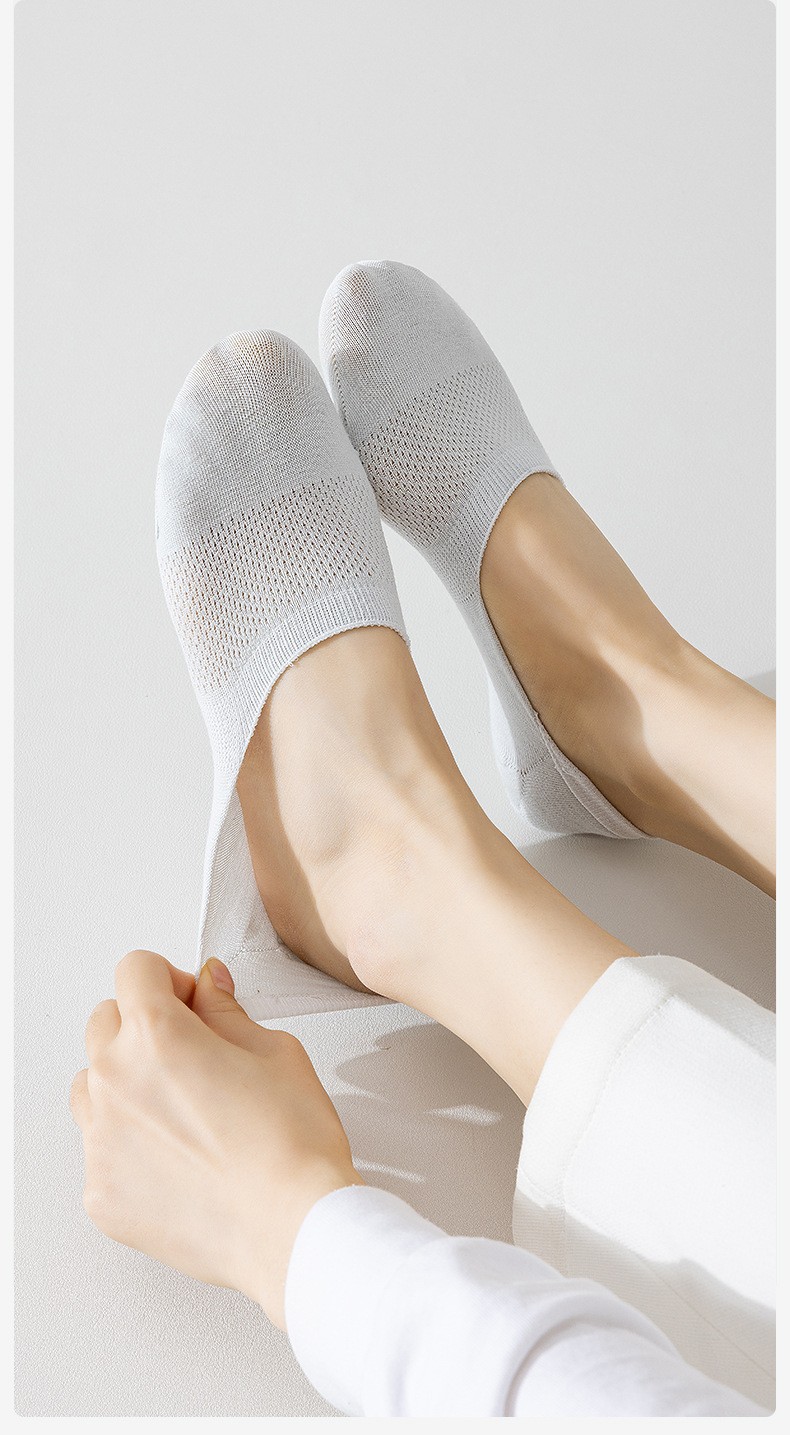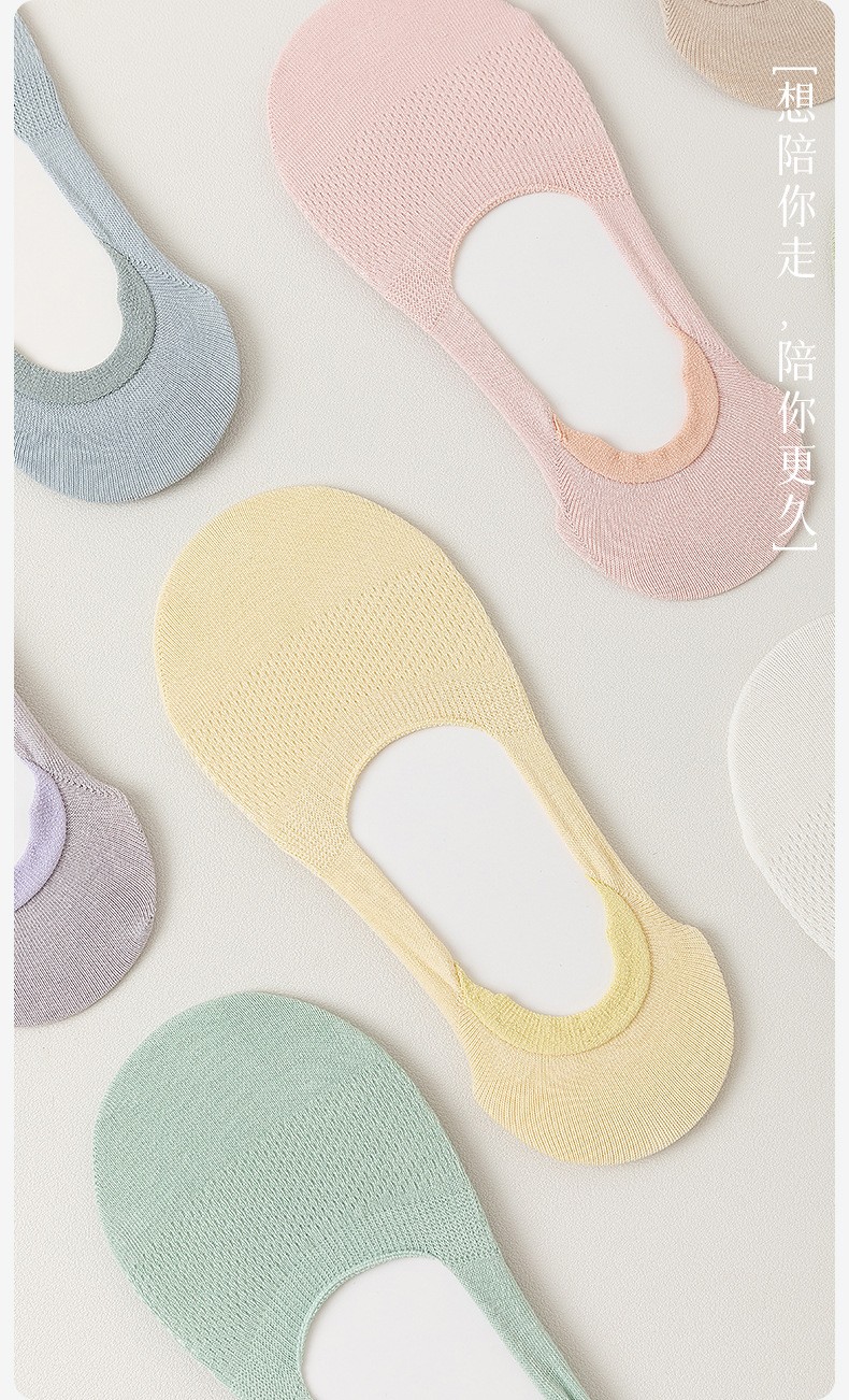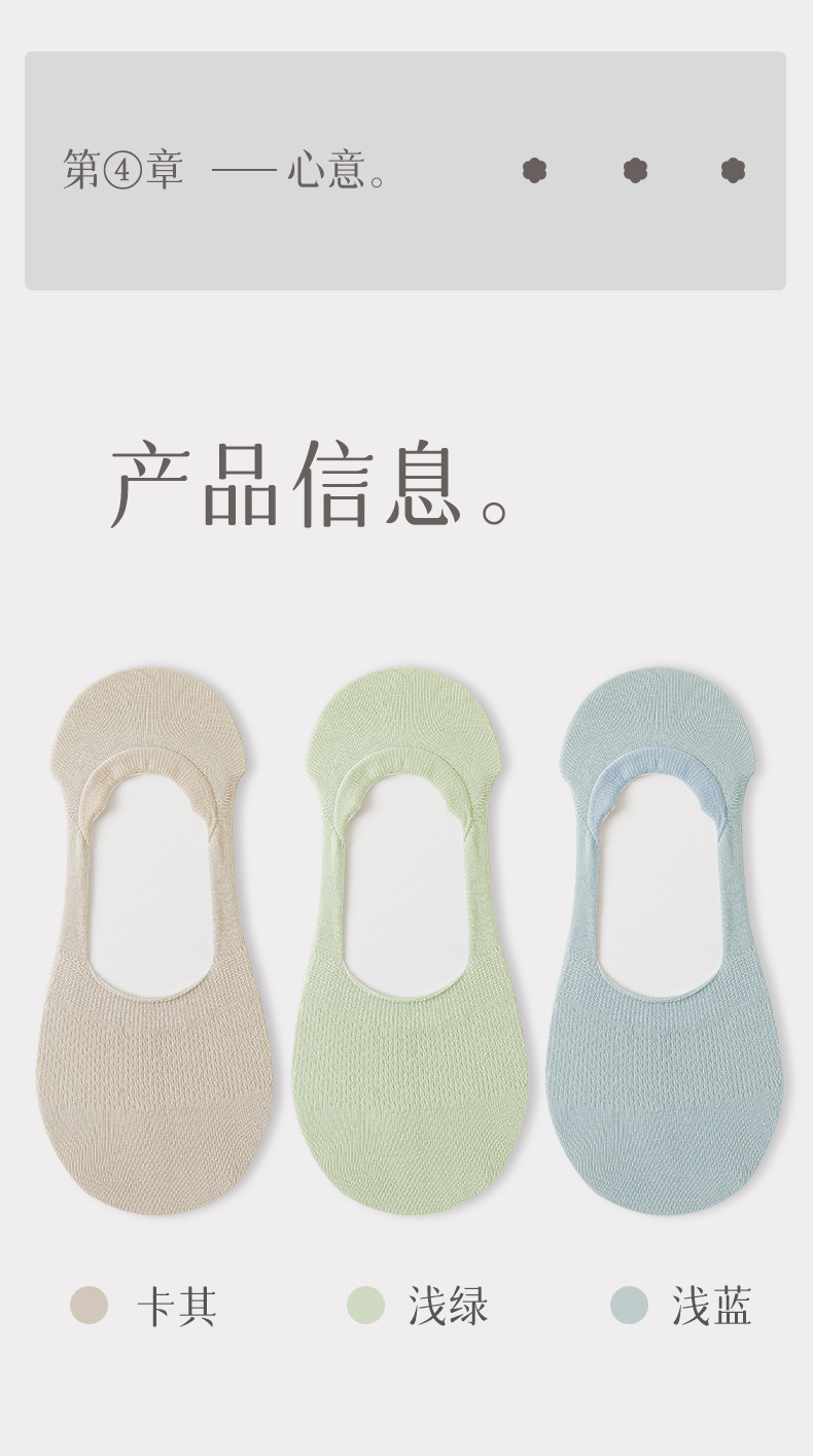工艺:200针短袜、40支紧密赛络、四级抗起球、3A抗菌、手工缝合,网眼超薄透气隐形袜,后跟硅胶防掉跟