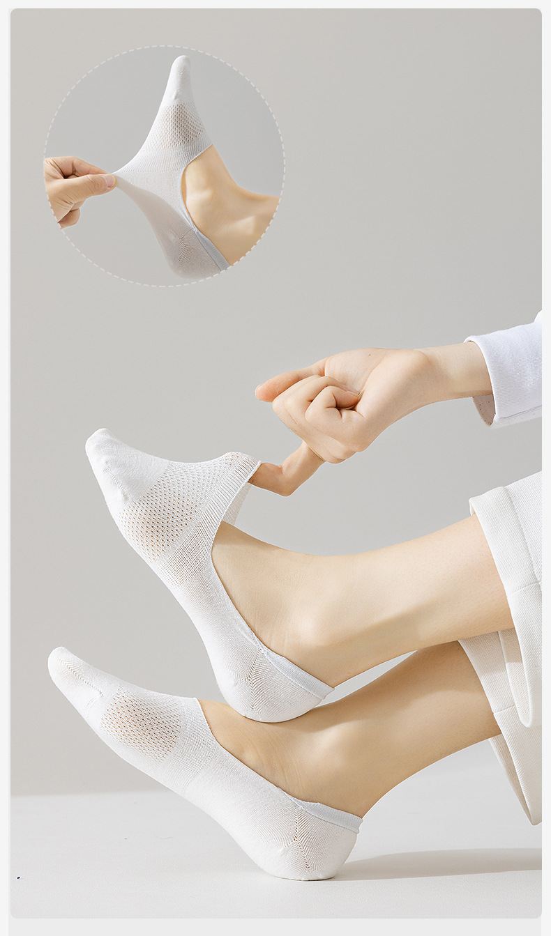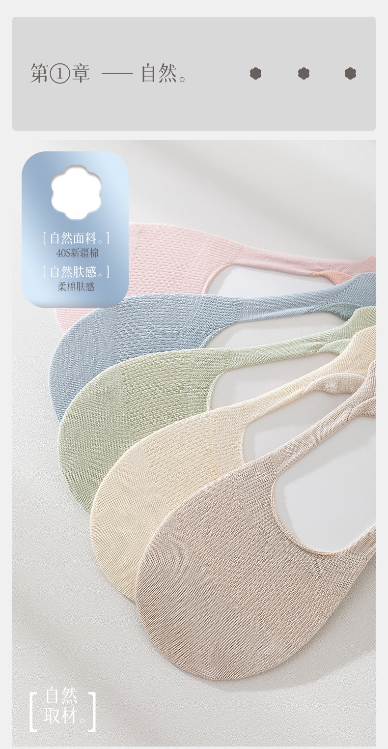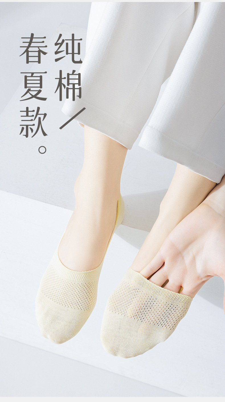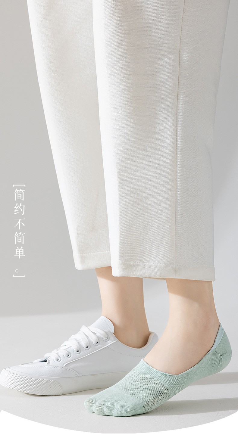 工艺:200针短袜、40支紧密赛络、四级抗起球、3A抗菌、手工缝合,网眼超薄透气隐形袜,后跟硅胶防掉跟