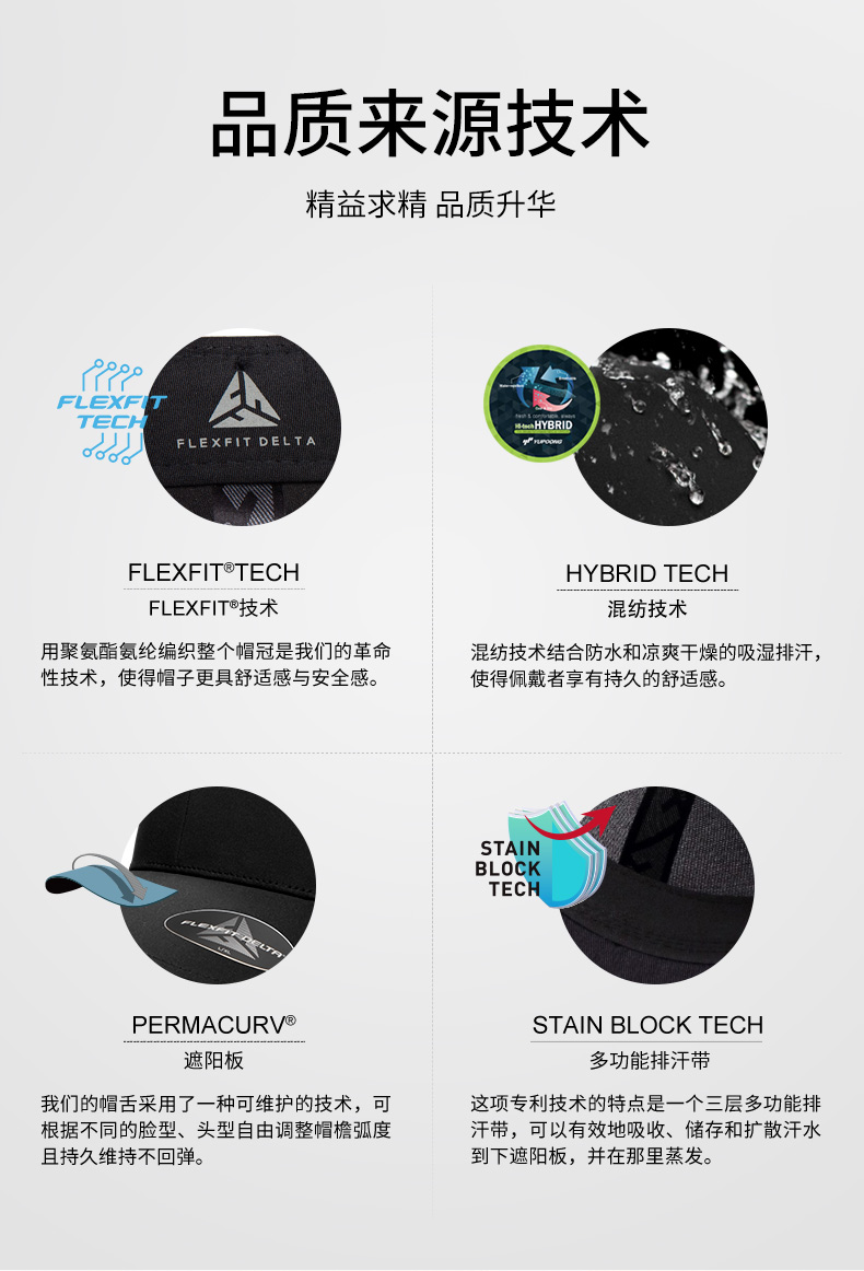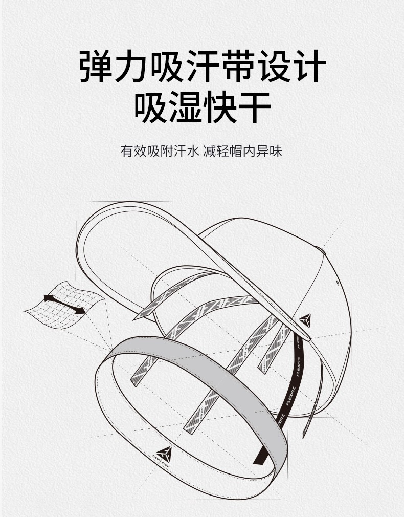帽子采用无缝技术的最大限度技术,拥有不沾汗渍和污渍的多功能面料(特性:无缝科技、轻薄透气、防水功能、弹力面料、防晒抗紫外线等多种科技于一身),三层弹力吸汗带吸湿排汗、抗菌,头感舒适,有效吸汗,革命性的防污技术,将汗水从底额中扩散并蒸发,防止帽子上产生多余的汗渍,当然,他还有FLEXFIT技术最原始的特点就是舒适度。