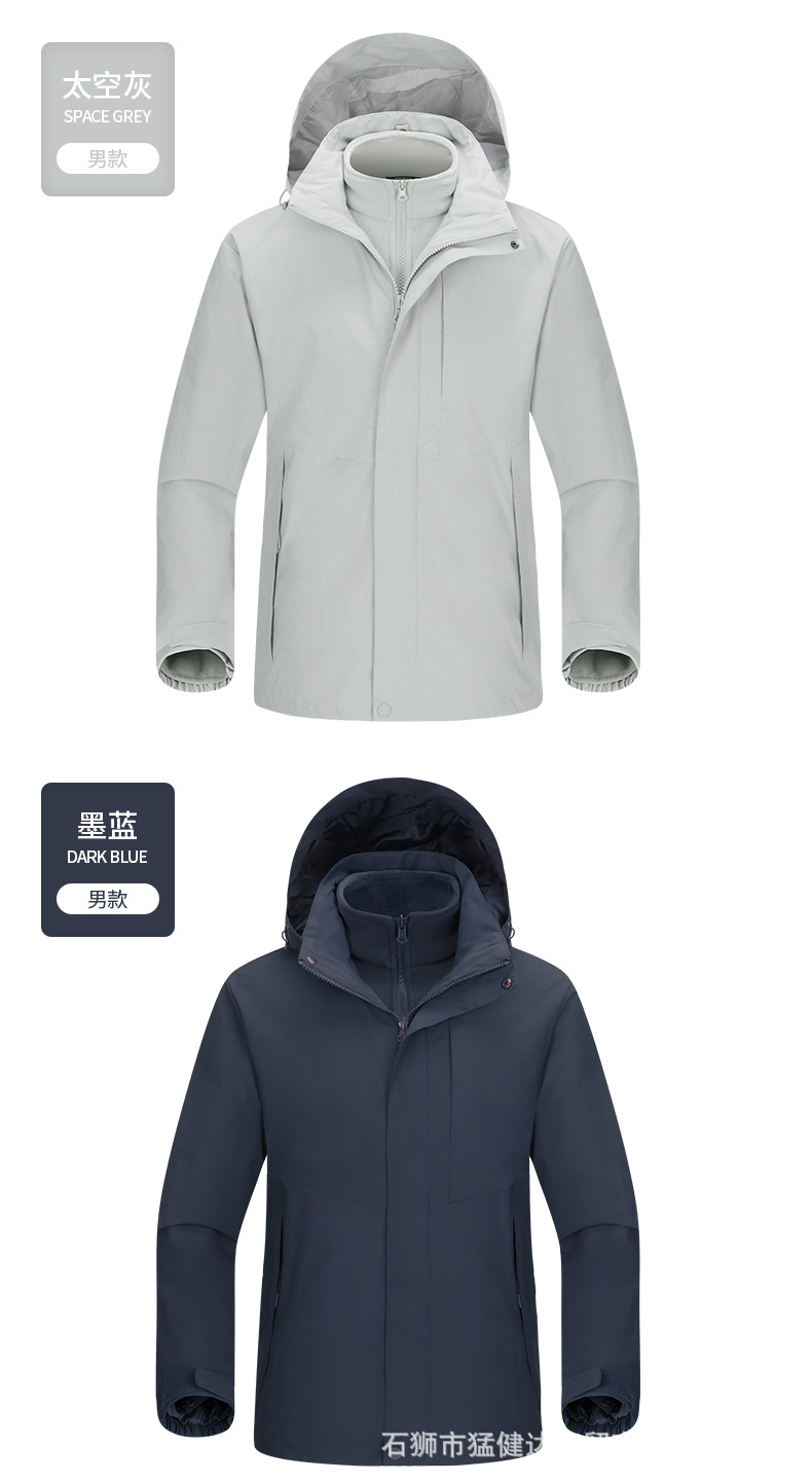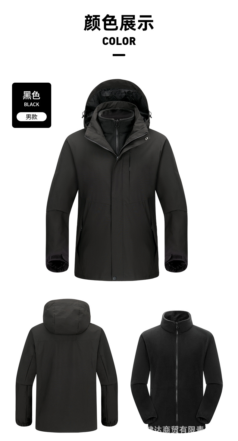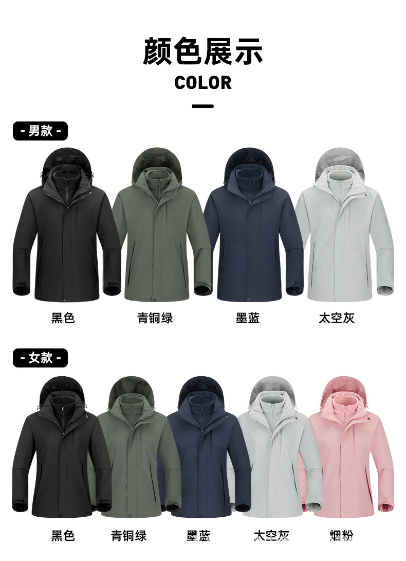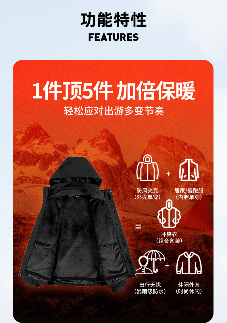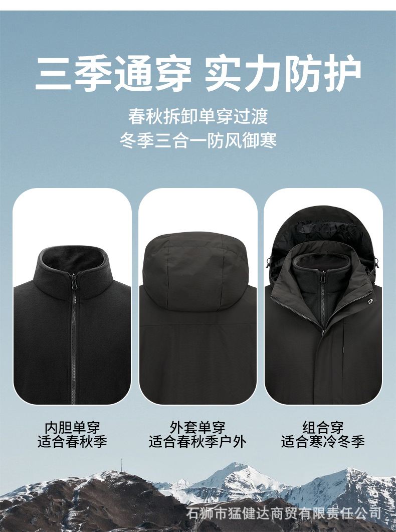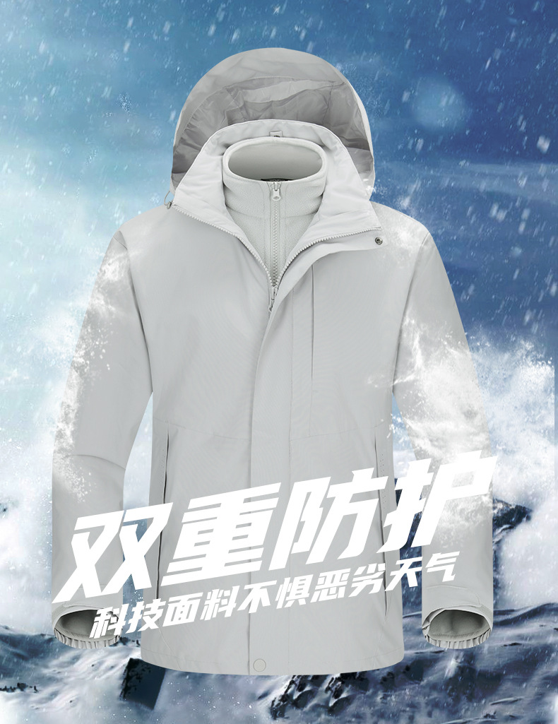 工艺:柔肤棉高弹面料,不易褪色变形四级防泼水,防风保暖更舒适外套内胆可拆卸组合,一衣三式穿YKK品质拉链,经久耐用顺滑不卡壳360g亲肤银狐绒内胆,抗静电科技