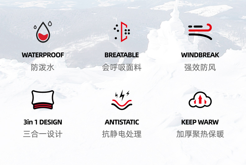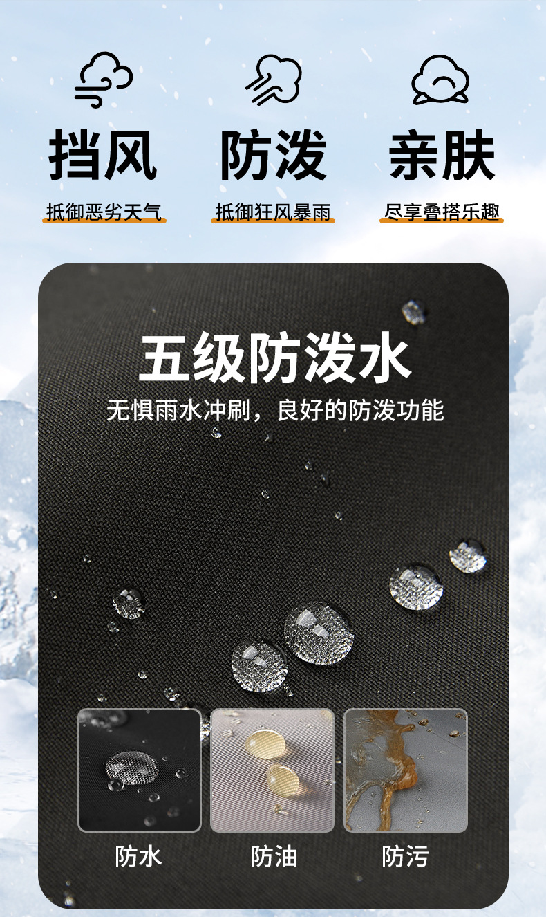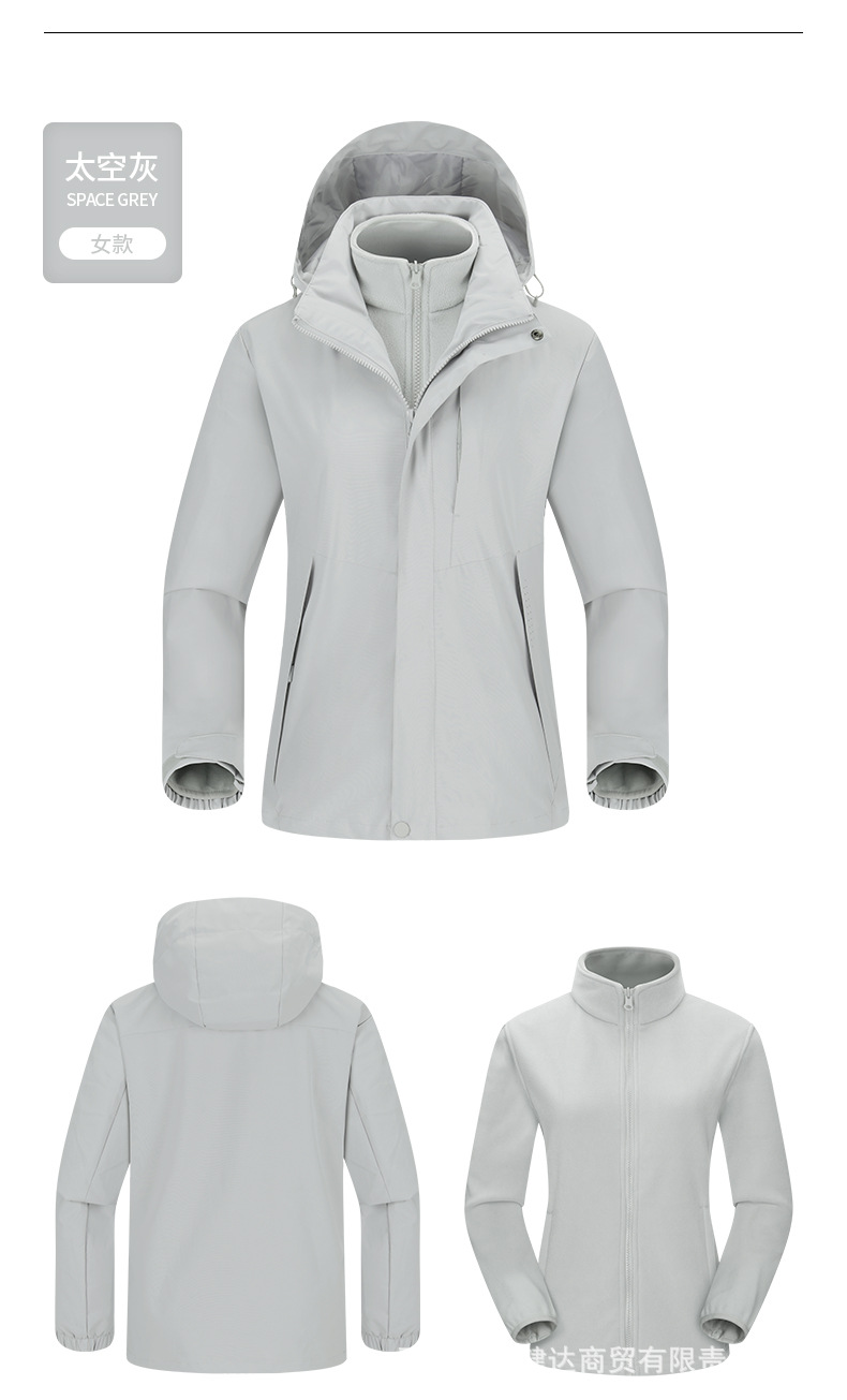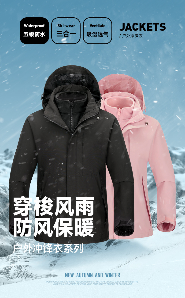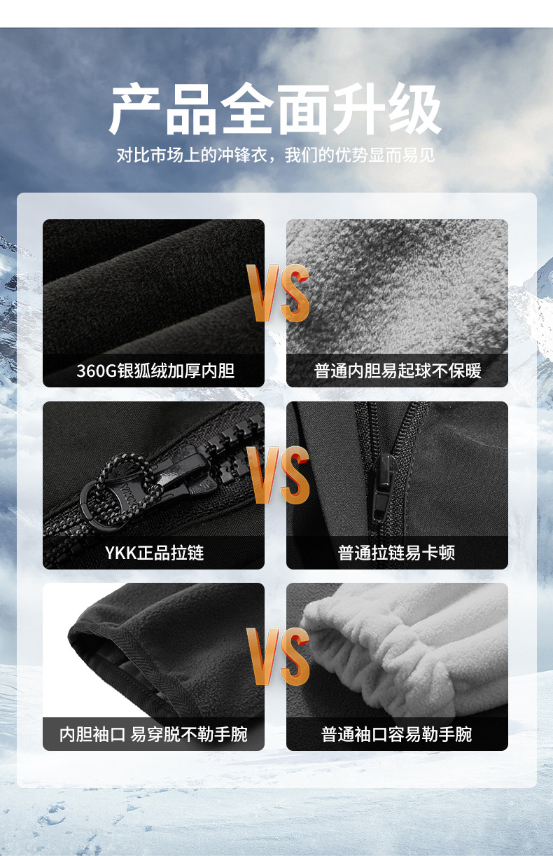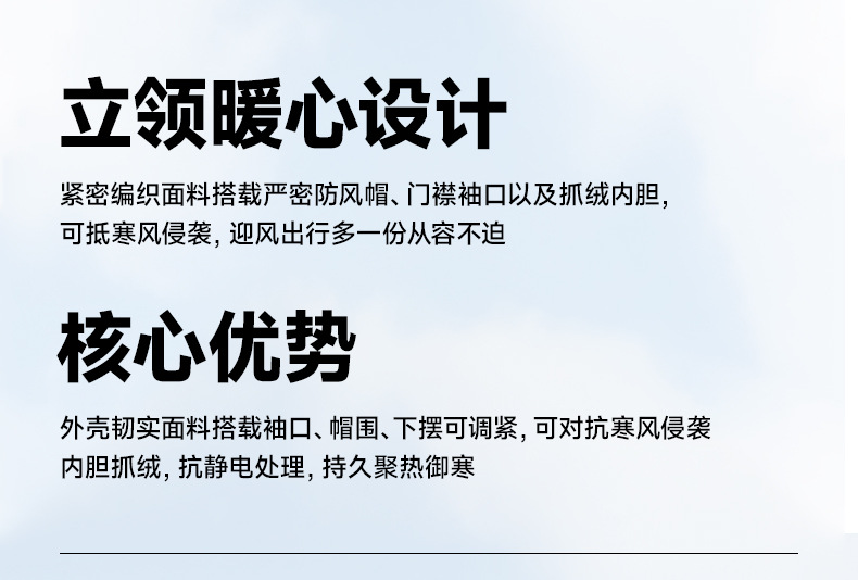 工艺:柔肤棉高弹面料,不易褪色变形四级防泼水,防风保暖更舒适外套内胆可拆卸组合,一衣三式穿YKK品质拉链,经久耐用顺滑不卡壳360g亲肤银狐绒内胆,抗静电科技