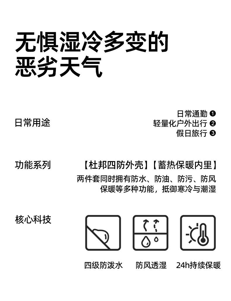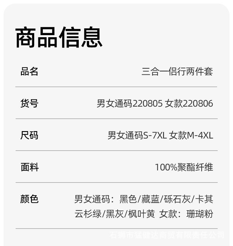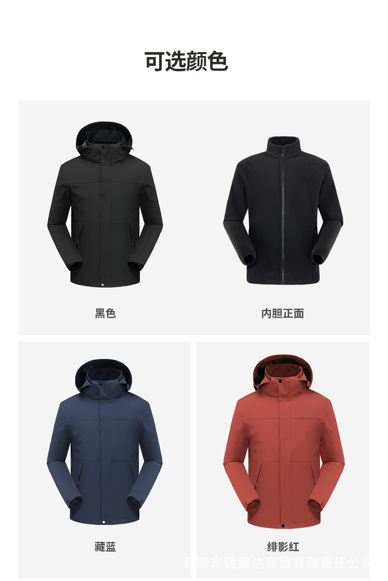 工艺:150D高弹单经双纬小牛津面料杜邦四防科技,防水防风、防油防污外套内胆可拆卸组合,一衣三式穿YKK品质拉链,经久耐用顺滑不卡壳内胆袖里加衬布,舒适亲肤穿脱方便320克超细摇粒绒内胆,抗静电科技