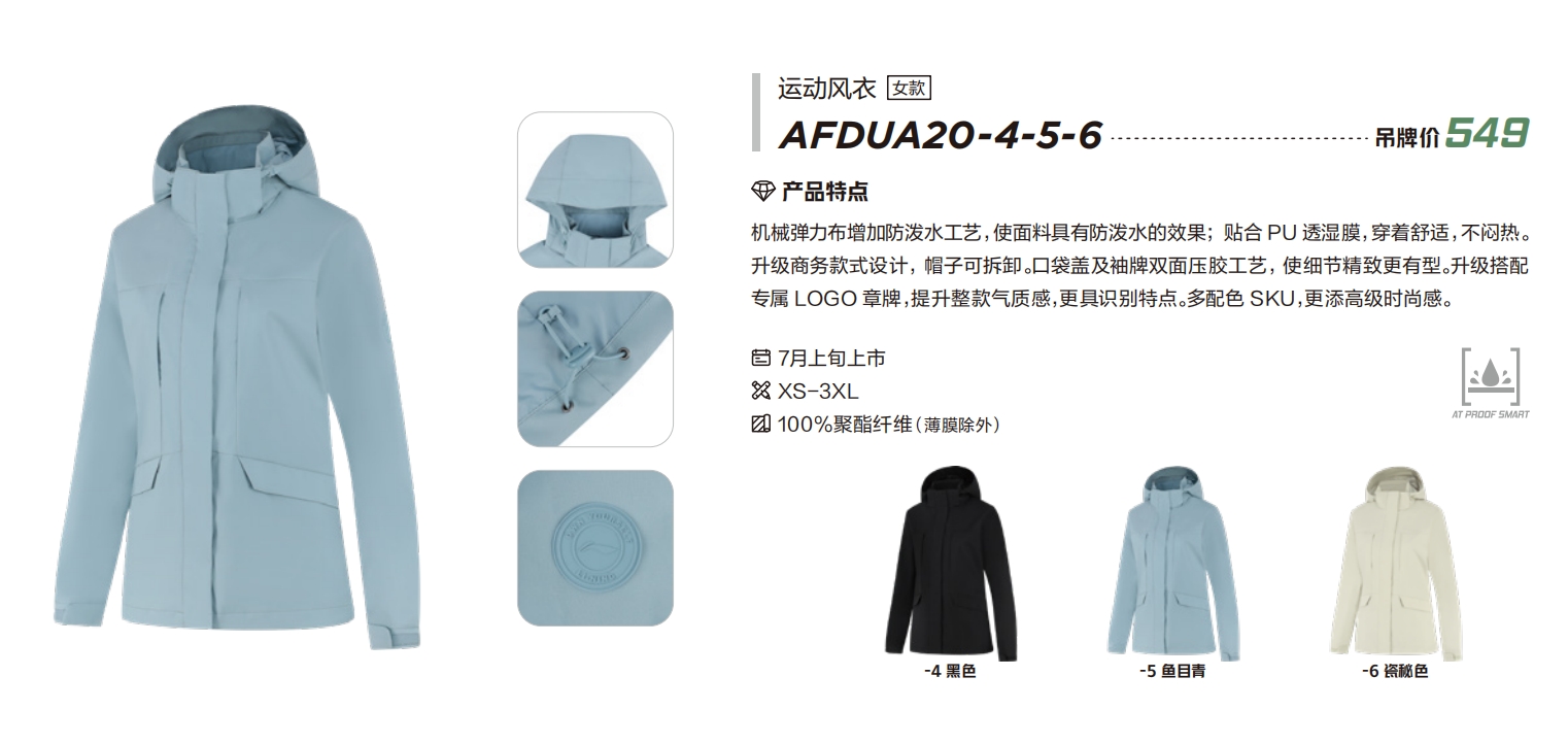 产品特点:机械弹力布增加防泼水工艺,使面料具有防泼水的效果贴合PU透湿膜,穿者舒适,不闷热。升级商务款式设计,帽子可拆卸。口袋盖及袖牌双面压胶工艺,使细节精致更有型。升级搭配专属LOG0章牌,提升整款气质感,更具识别特点。多配色SKU,更添高级时尚感。