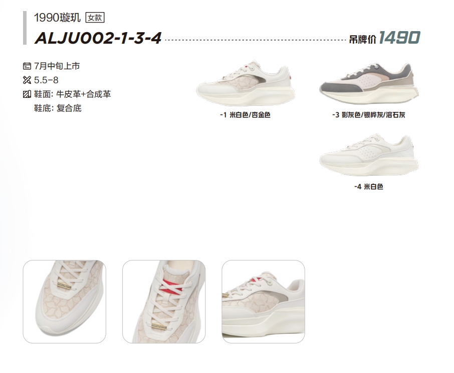 产品特点:精致运动风格与时尚廓形碰撞,男女通吃的一款百搭鞋款;一双拥有轻量化的时尚跑鞋;从北斗星中萃取灵感,前四星也叫魁北斗,形态犹如碗状,也成箱形,整个璇玑的底部廓形完美地贴合了箱形;中底加厚:符合当下女性显性的心理需求,也满足部分男性隐性心理需求;流畅的线条廓形,增加科技未来感,无论时尚还是实事都是高热度话题;鞋面流畅简约的线条和鞋子整体上表达出来的干练内敛的气质,来自于一句古人的心境:“行到水穷处,坐看云起时”,正是这种高山流水、泰然自若、清醒自持的人生态度,像北极星一样不断地引导着我们修正方向,走向归家的路;新春版 - 使用了以龙鳞为元素的 ICON 提花布料与皮料拼接,配色点缀红金,细节处彰显新春喜气富贵;ALJU001 和 ALJU002 同时提供基础色与复古色 SKU,不同质感皮料拼接;
