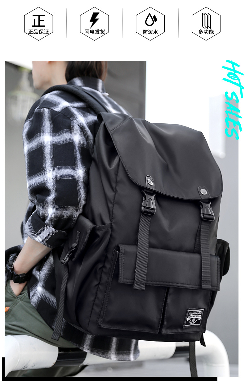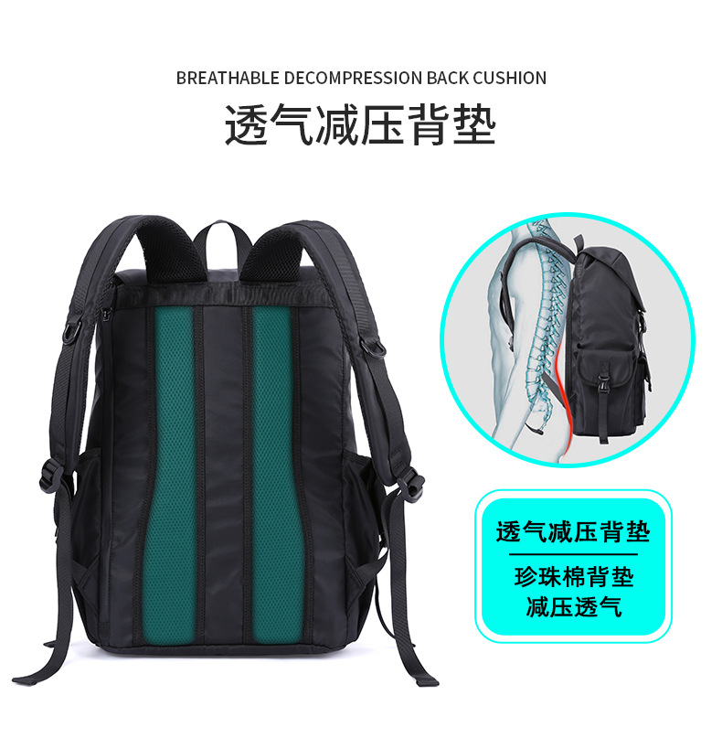 产品特点:大容量合理分配功能齐全,隔层可放15寸笔记本电脑, 侧面扩容袋,前部分类袋,内部电脑隔层,防泼水面料,无惧天气,一擦就干,透气减压背垫,珍珠棉背垫 减压透气,背部拉链可以直接连通主袋,出行取放物品更方便,防盗设计,背部主袋拉链设有插扣防盗。
