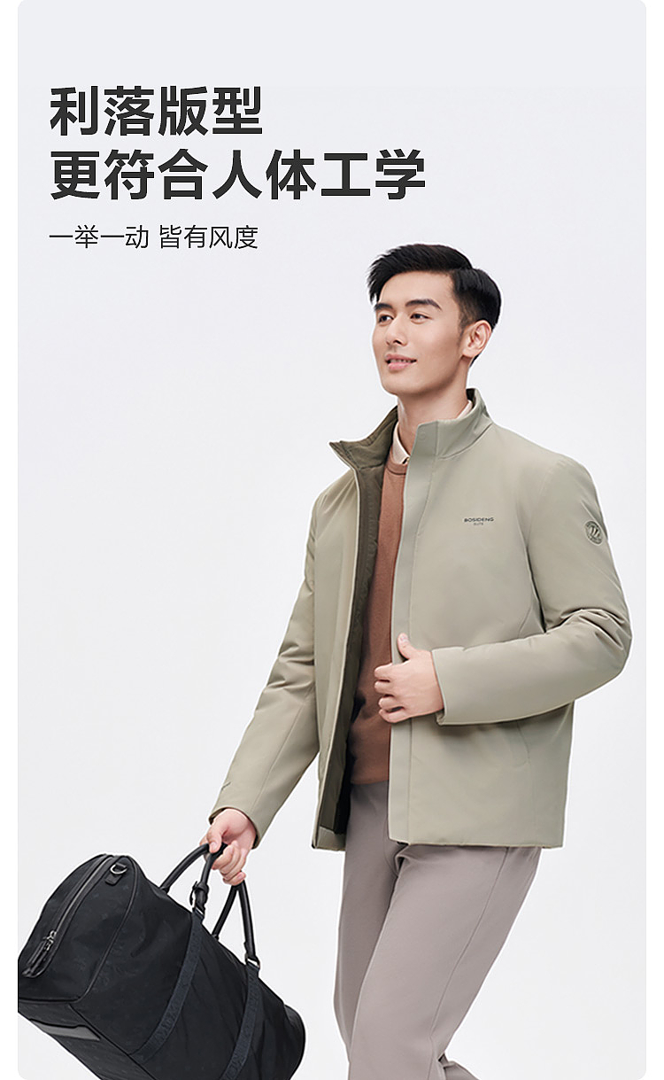 设计点:合体H商务版型,合体舒适,品质面料,紧致细腻,手感滑爽,品质卓越,内里直充绒工艺,无缝压胶,减少压线跑绒风险。