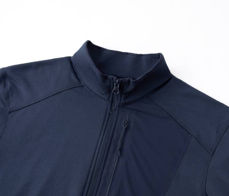 设计点:抓绒面料结合镂空网格结构,具有高效软重比,颈部拉链衫位在凉爽的天气下开展低强度活动而设计保暖吸汗,贴身舒适。拼接剪裁,活动自如,腋下插角布,压胶拉链压胶胸袋