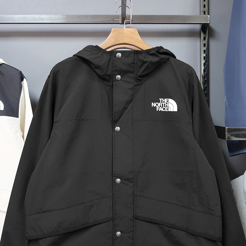 设计点:亚洲版型,宽松剪裁;防风面料;DWR防泼水处理,防护性更强;三片式固定风帽;带搭扣闭合和前中反装拉链的防风片设计;带反装开口的带盖插手贴袋设计;风帽、口袋和袖口带弹力滚边设计;下摆抽绳配有绳锁扣,便于调节;左胸和右后肩带丝印品牌标识设计。