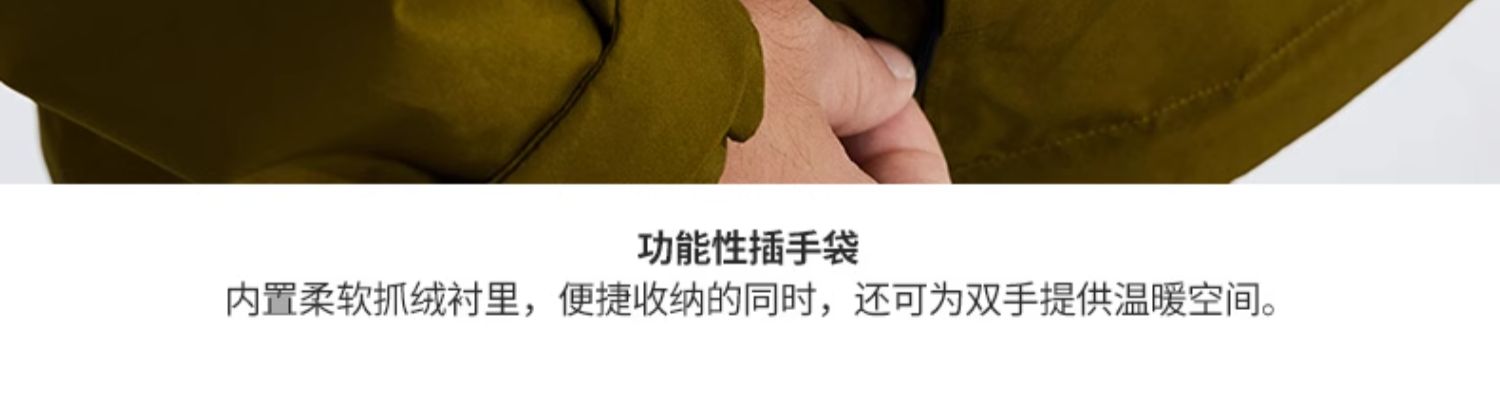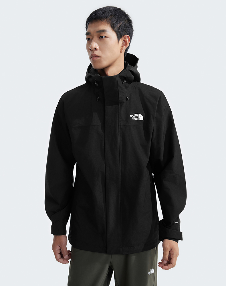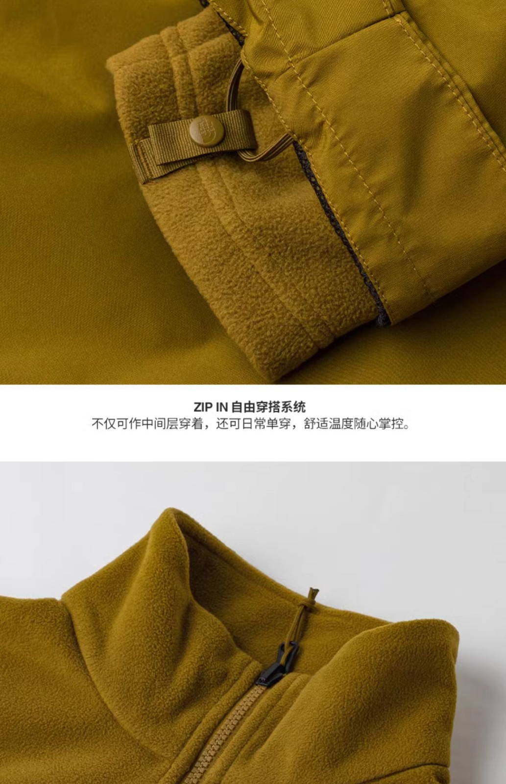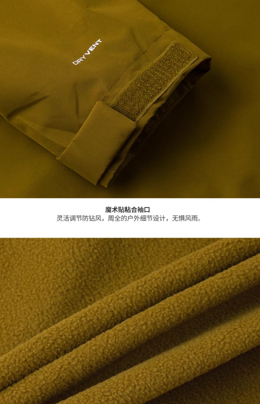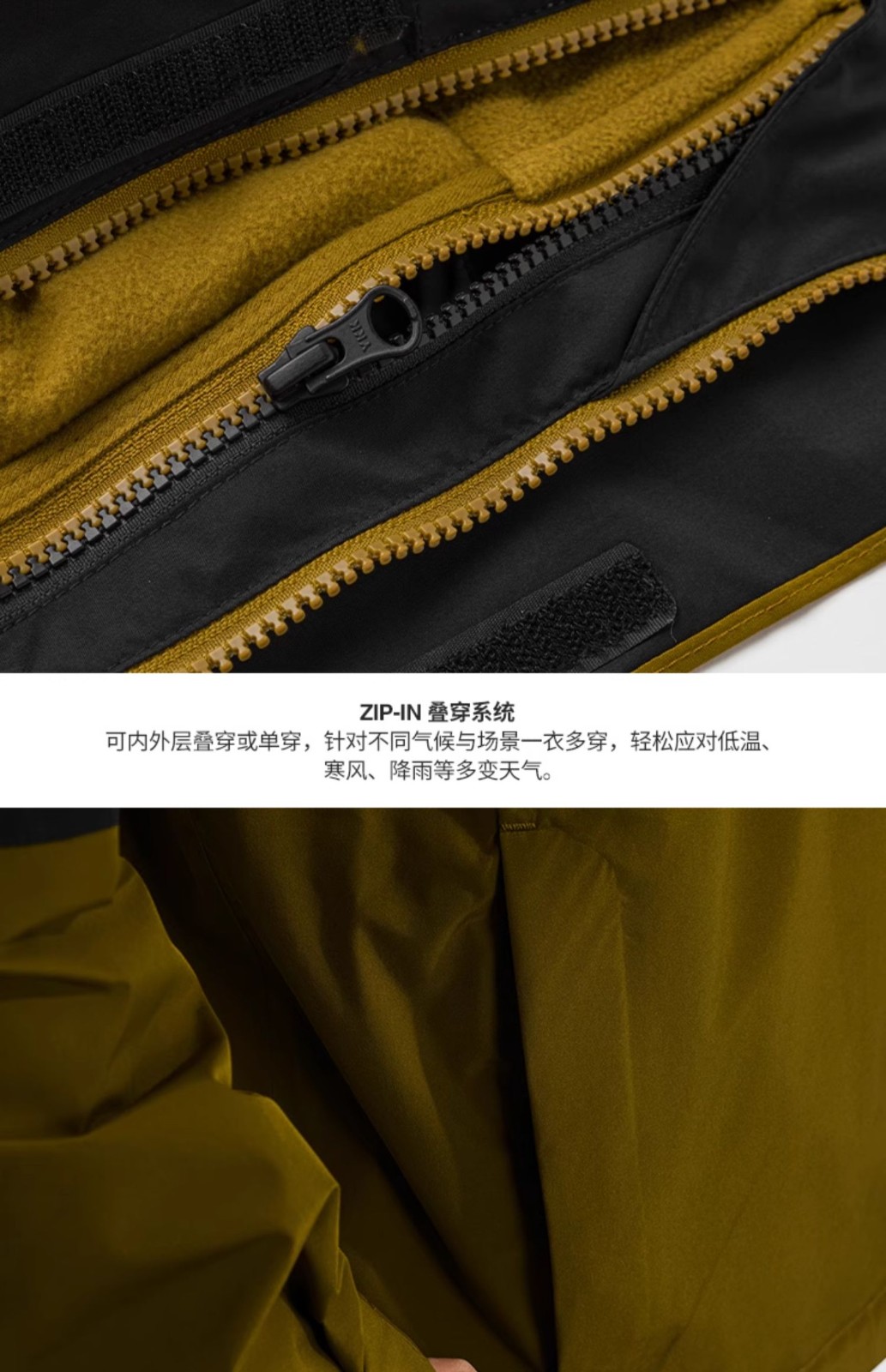 设计点:亚洲版型,宽松剪裁;外层夹克防水面料,无缝工艺;袖口一片式设计;风帽可调节;下摆可调节抽绳;魔术袖口,;塔夫绸网布衬里;功能性插手袋;热转印品牌标识;内胆:宽松剪裁;抓绒;塔夫绸衬里;弹力下摆和袖口。