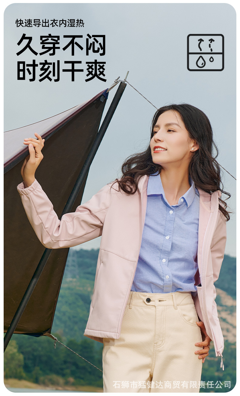 设计点:75D四面弹复合144F小方格摇粒320g四级防泼水、四级色牢度、防冷风连帽设计,3D裁剪,360°防风功能YKK品质拉链,经久耐用顺滑不卡壳.