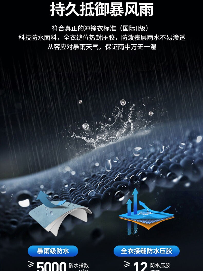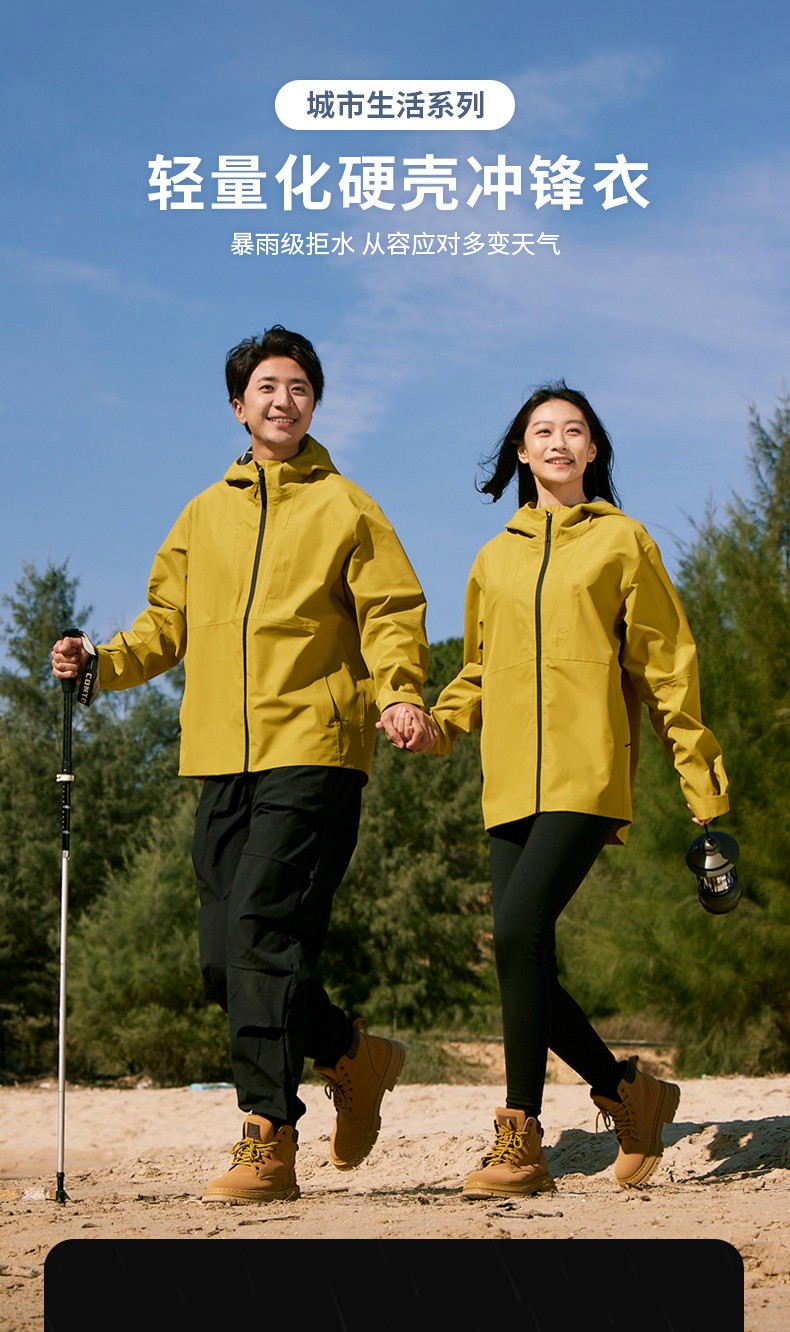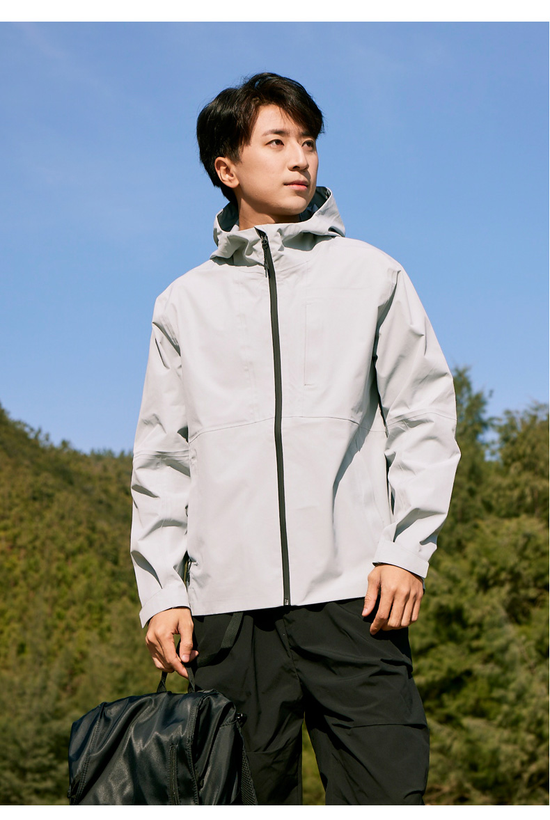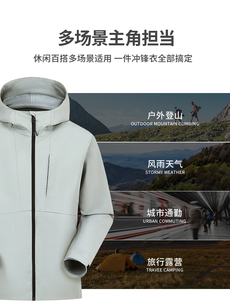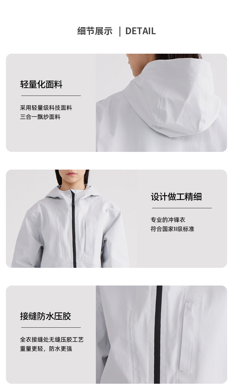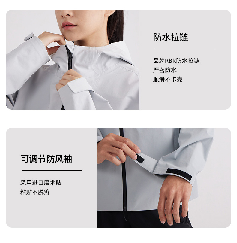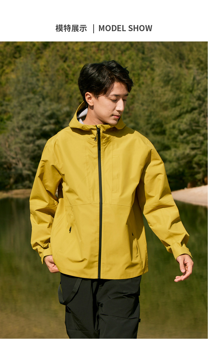 设计点:70D高密三合一面料 不易褪色变形全衣缝位热封压胶,3D版型裁剪静水压、透湿率5000+,四级防泼水RBR品牌科技防水拉链,严密防水轻量化科技硬壳,行动自如无束缚感.