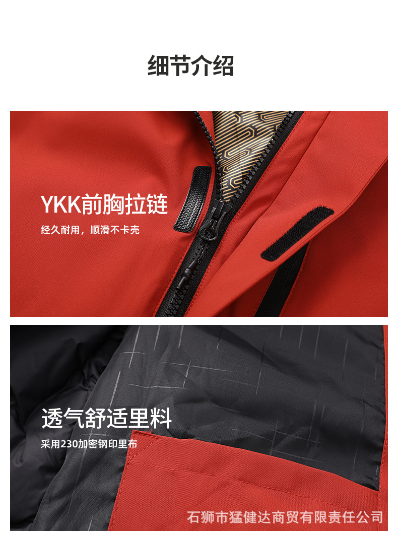 设计点:75D双股棉感小牛津,不易褪色变形四级防泼水,四级色牢度,抗静电科技里布为230加密定制印花布,极具特色帽子内里采用加厚丝光绒,亲肤更保暖YKK品质拉链,经久耐用顺滑不卡壳新国标90鸭绒内胆,石墨烯聚热科技。