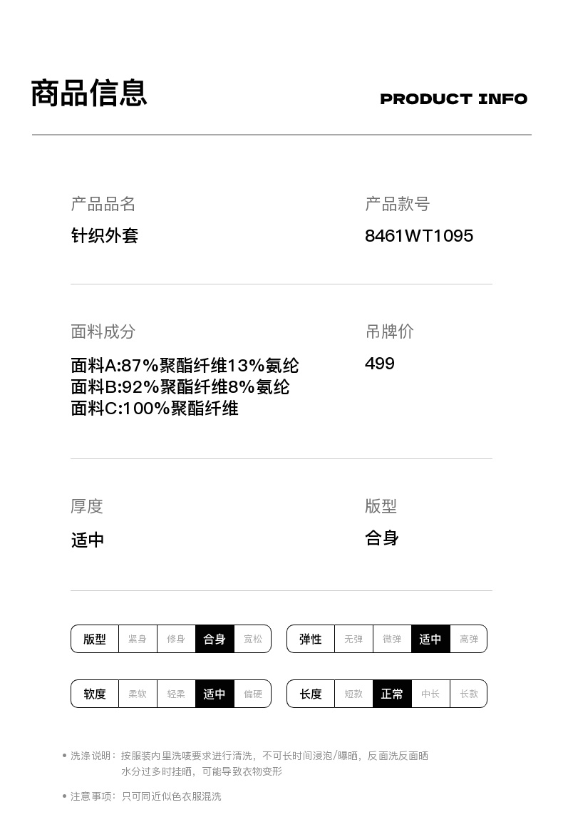材质:面料A:87%聚酯纤维13%氨纶 面料B:92%聚酯纤维8%氨纶 面料C:100%聚酯纤维