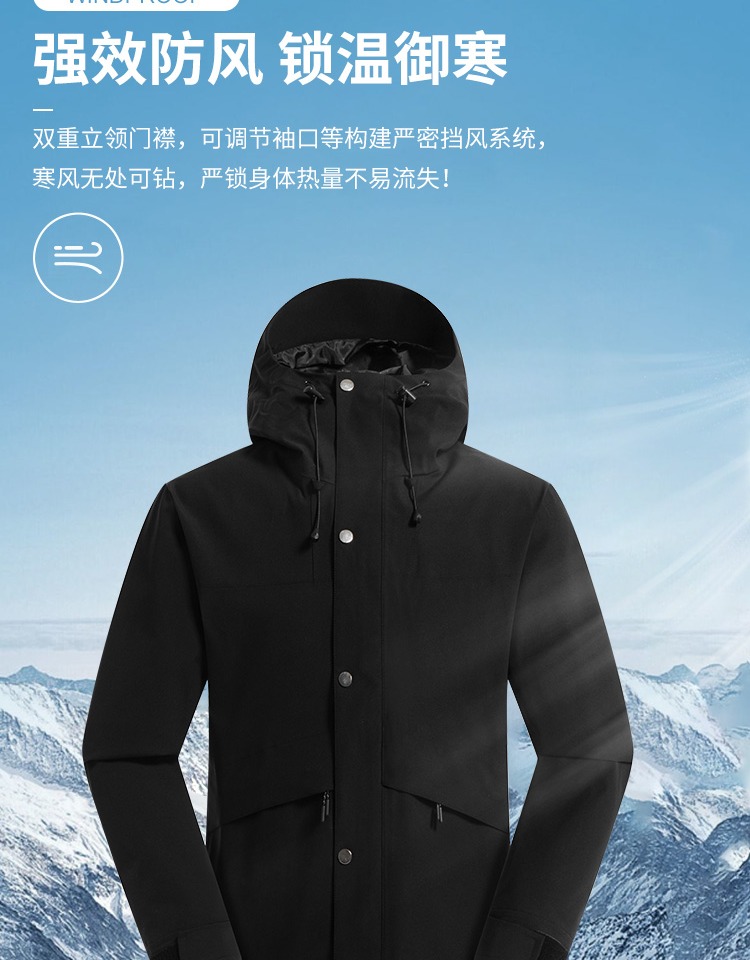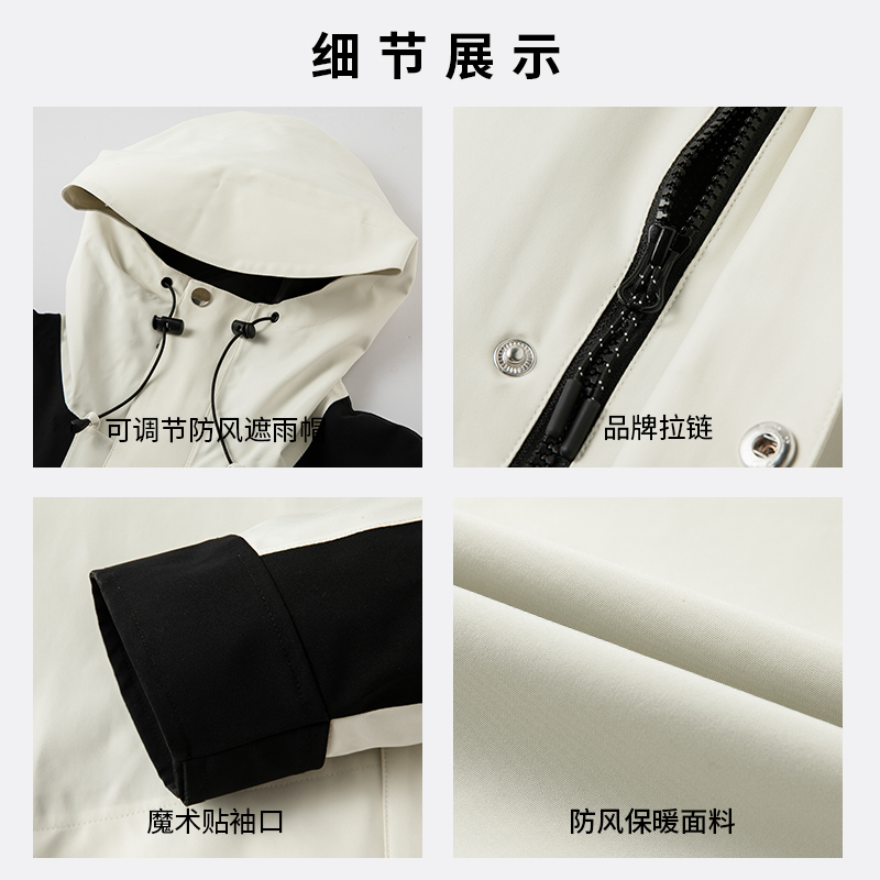 设计点:热风压胶 YKK拉链 冲锋衣Ⅱ级标准。