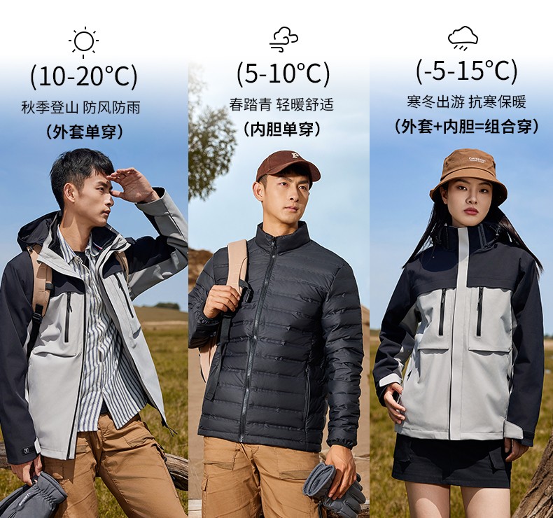 材质:表皮:T800棉感尼龙 内里:300春亚纺+高档网布 摇粒绒内胆:100D超柔超细复合摇粒绒 羽绒内胆:90%鸭绒125克