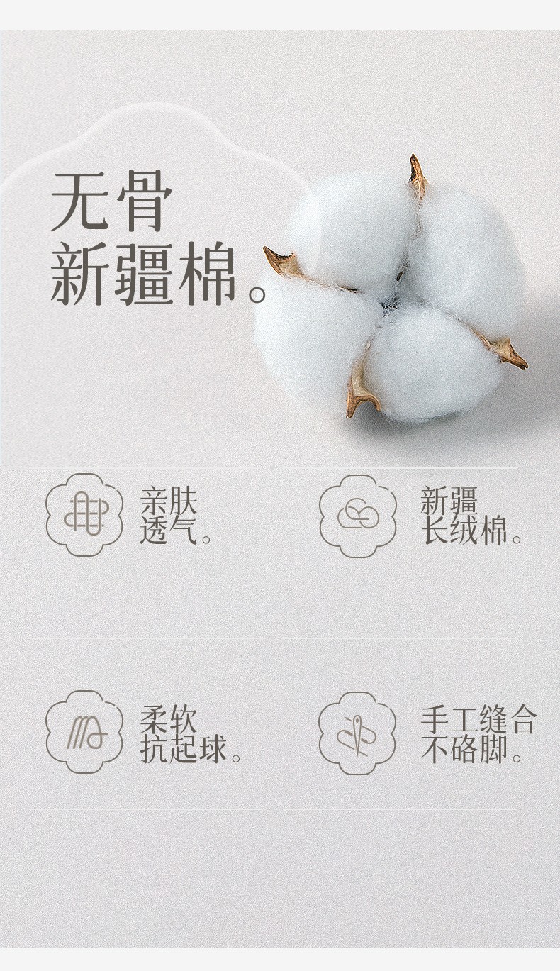 工艺:200针,32支极致纱,四级抗起球,5A抗菌消臭,手工无骨缝合