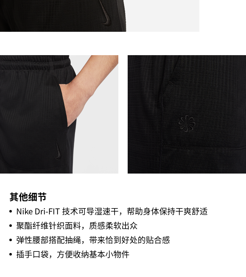 工艺:Nike Dri-FIT 技术可导湿速干,帮助身体保持干爽舒适。聚酯纤维针织面料,质感柔软出众 弹性腰部搭配抽绳,带来恰到好处的贴合感。插手口袋,方便收纳基本小物件
