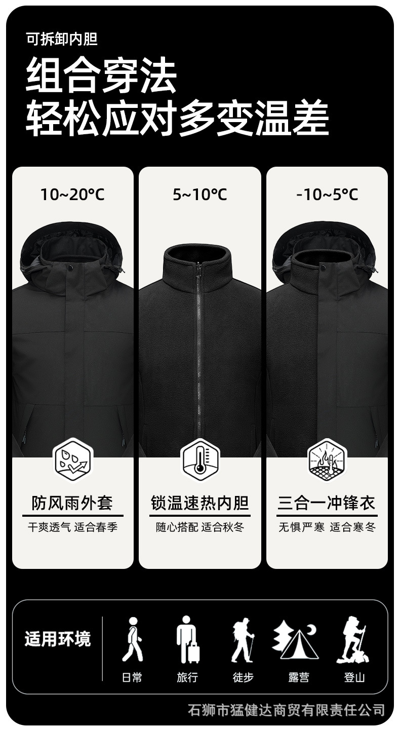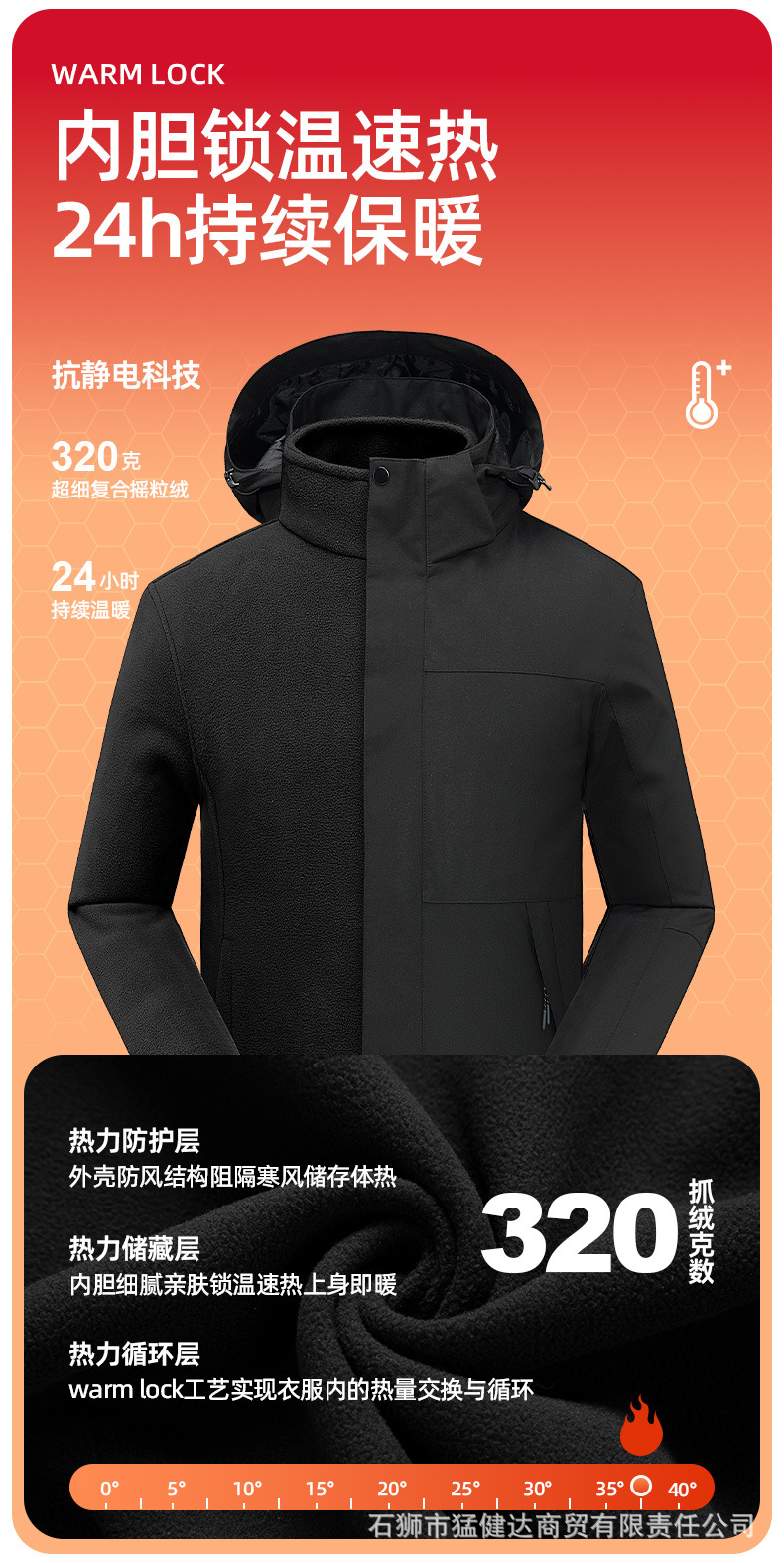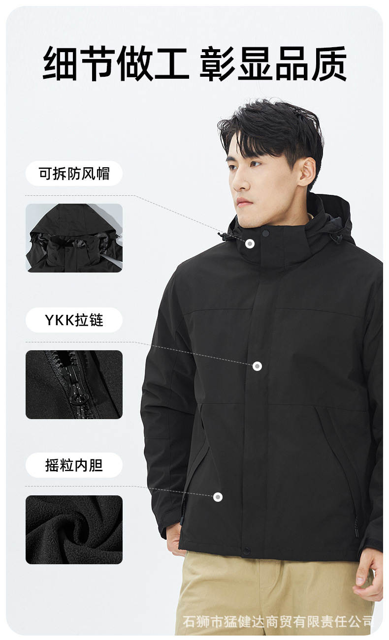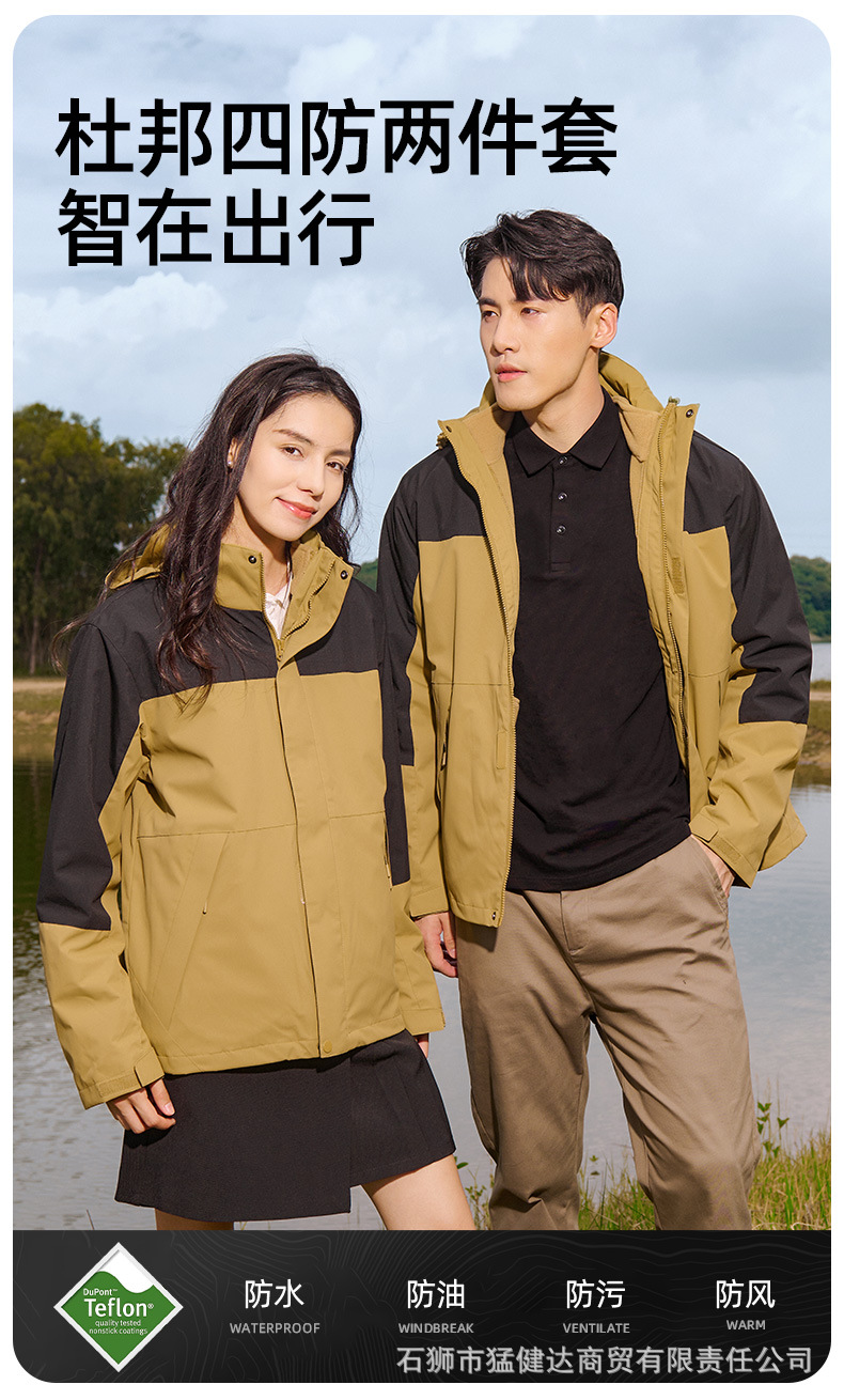 工艺:150D高弹单经双纬小牛津面料杜邦四防科技,防水防风、防油防污外套内胆可拆卸组合,一衣三式穿YKK品质拉链,经久耐用顺滑不卡壳内胆袖里加衬布,舒适亲肤穿脱方便320克超细摇粒绒内胆,抗静电科技