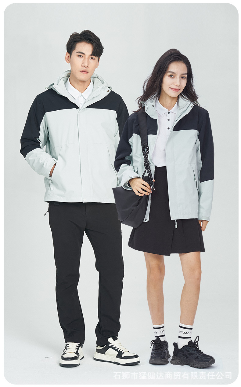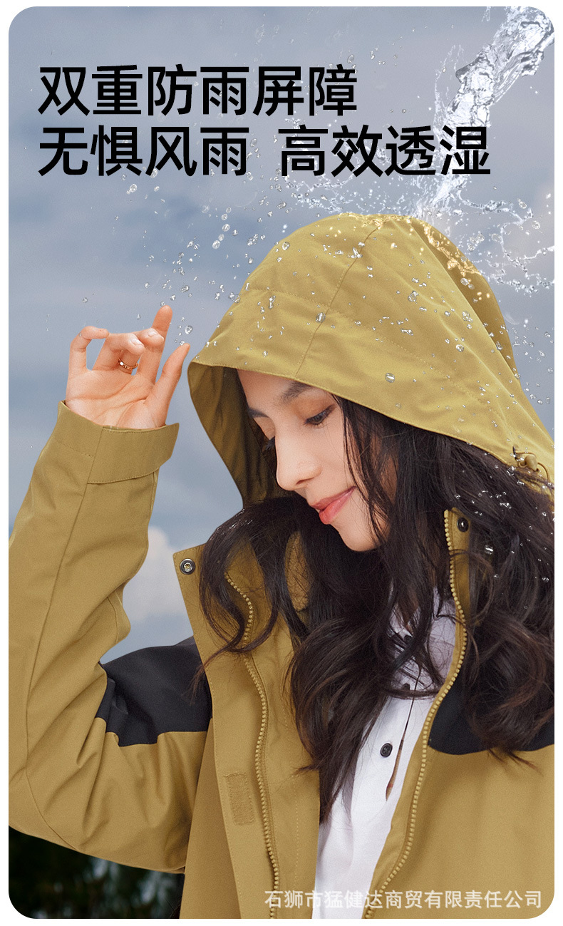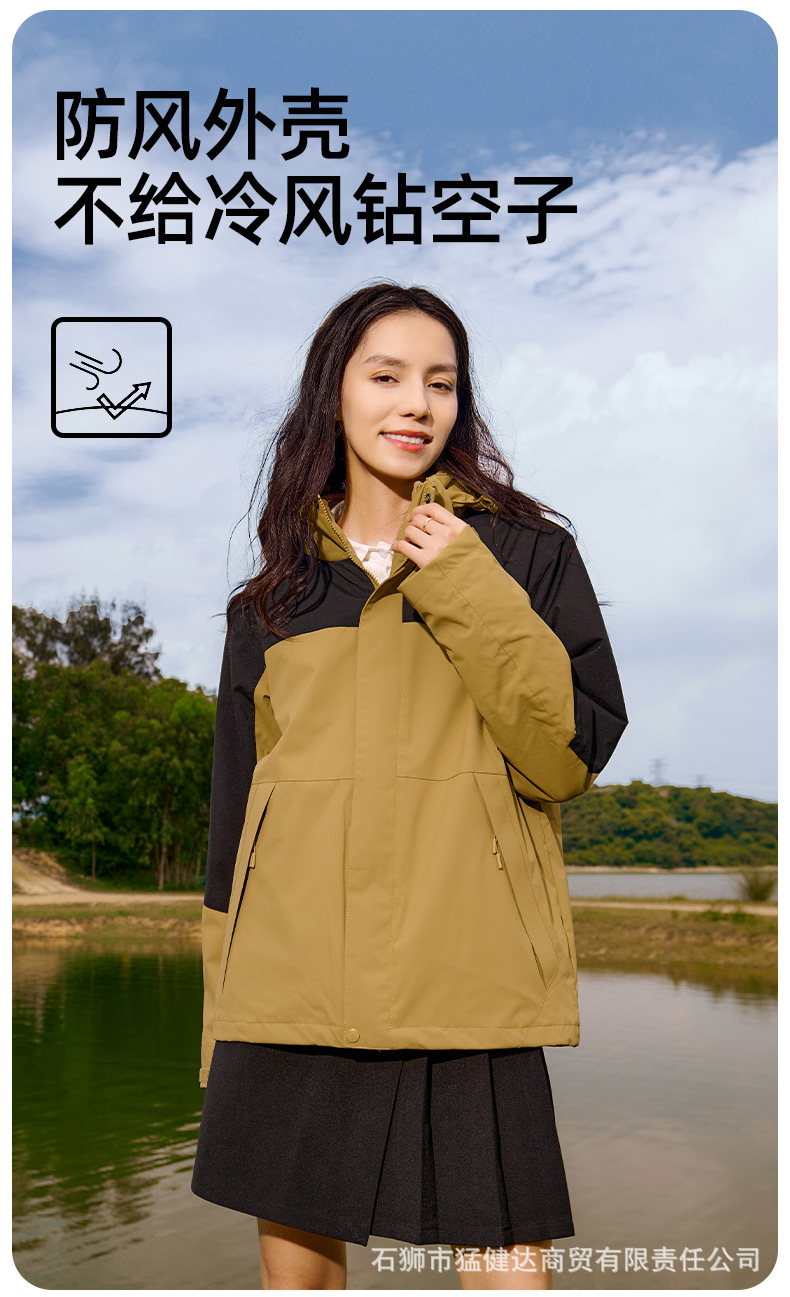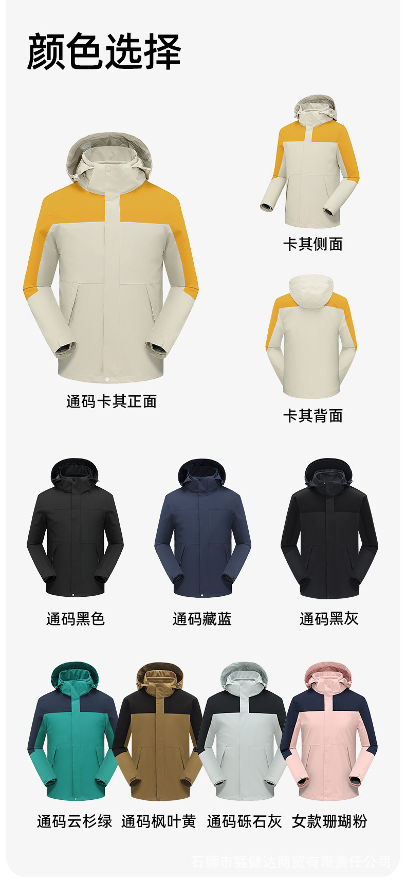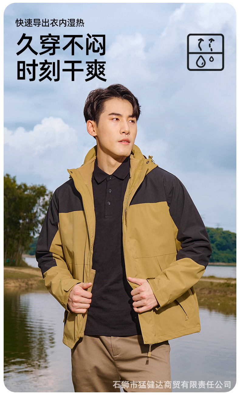工艺:150D高弹单经双纬小牛津面料杜邦四防科技,防水防风、防油防污外套内胆可拆卸组合,一衣三式穿YKK品质拉链,经久耐用顺滑不卡壳内胆袖里加衬布,舒适亲肤穿脱方便320克超细摇粒绒内胆,抗静电科技