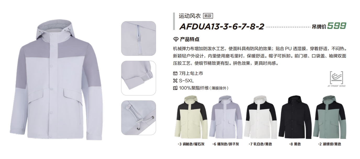 产品特点:机械弹力布增加防泼水工艺,使面料具有防风的效果;贴合PU透湿膜,穿着舒适,不阳热。新颖轻户外设计,内里使用磨毛里衬,保暖舒适。帽子可拆卸。前门襟、口袋盖、袖牌双面压胶工艺,使细节精致更有型。拼色效果,更具时尚感。