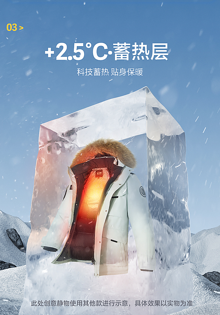 功能科技:BO-HEAT保暖科技,蓄热内里升温2.5°C.700+品质鹅绒