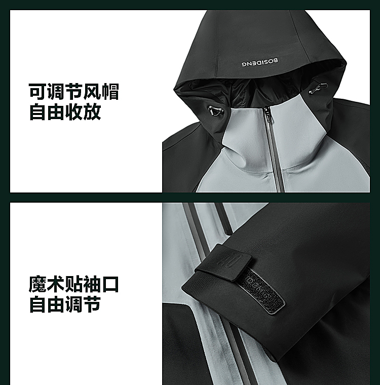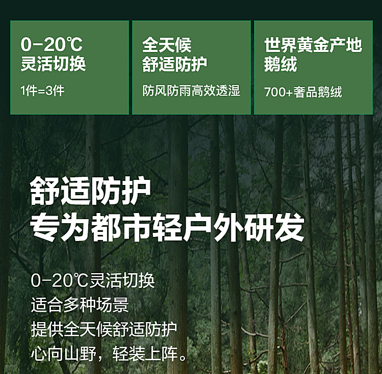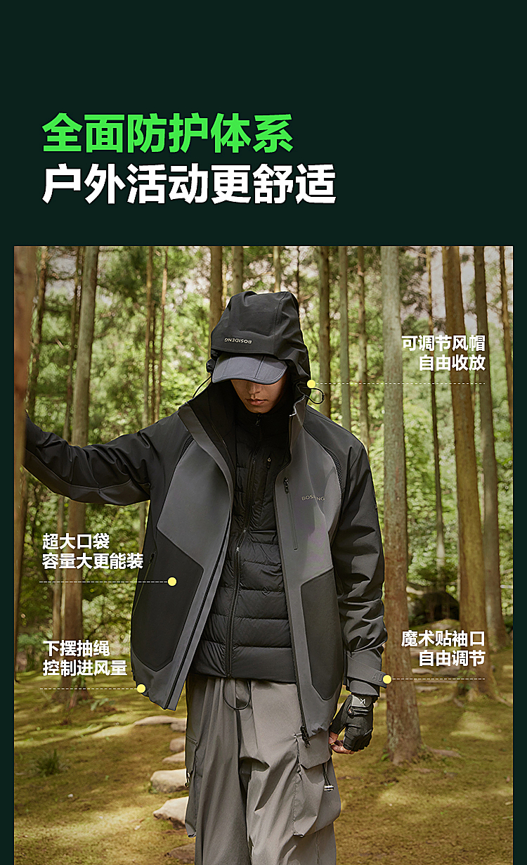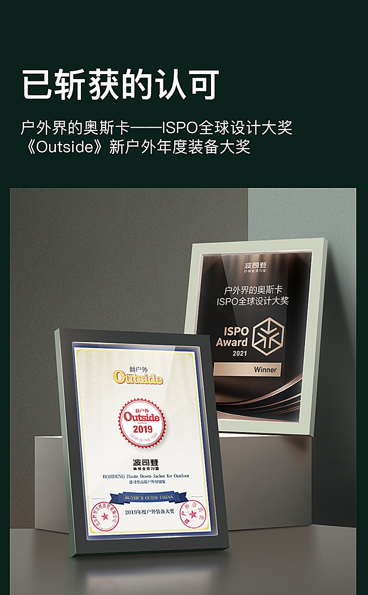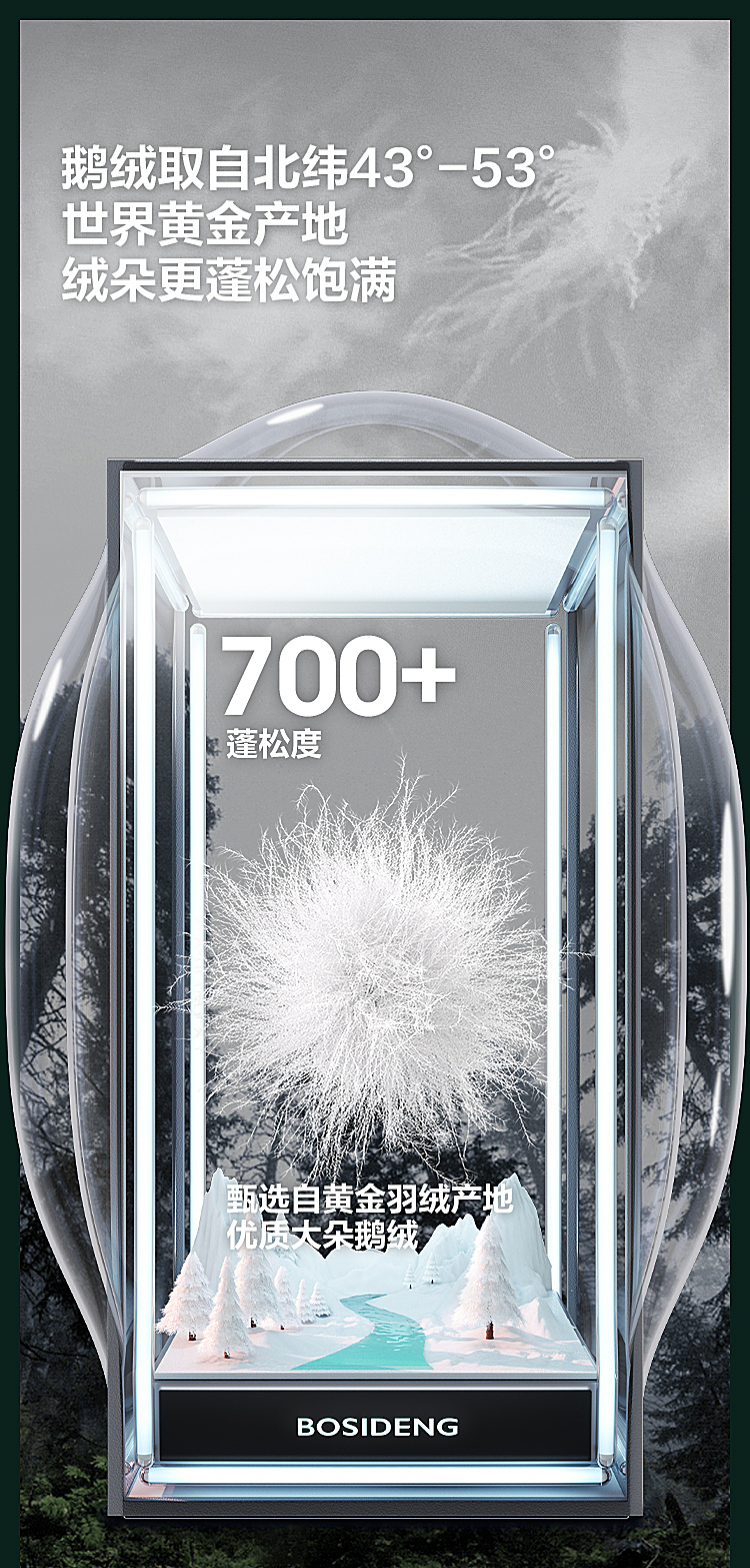 工艺:自主研发BO-Air呼吸体系,科技功能面料防风防水透视,700+蓬松度轻奢级鹅绒