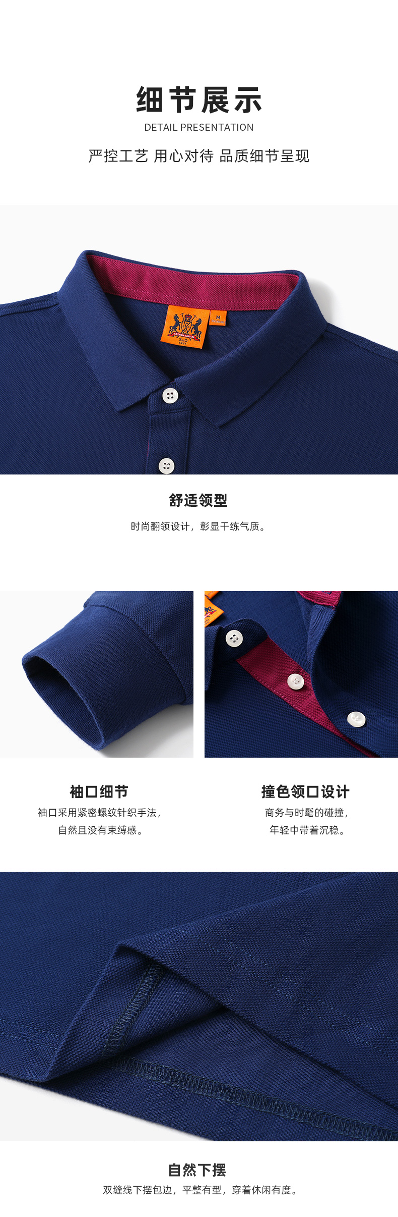 工艺:Polo时装美学-经典不衰,采用3D立体剪裁,经典Polo方领挺括大气, 打破传统工艺更贴合亚洲人身型曲线,多种最新流行百搭色系可选,同时满足通勤休闲多场景着装需求, 车工走线,工整细腻,一针一线完美呈现细节与品质。